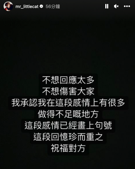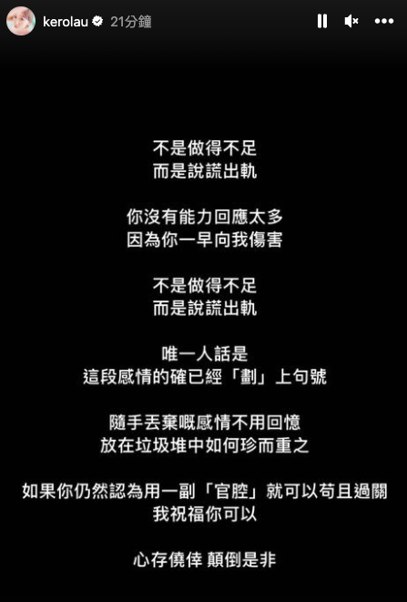 Kero最後強調自己並不是想用爆料拉下男方的事業「我相信男方應該知道,我本來可以寫的材料大概還有三份二。這一個星期以來,男方一直害怕我會公開此事,親口承認自己出軌,一直用『我道歉囉』『我錯哂囉』來表達關心。」細貓其後在IG直認是Kero口中所指的前度︰「不想回應太多,不想傷害大家,我承認我在這段感情上很多,做得不足嘅地方,這段感情已經畫上句號,這段回憶珍而重之,祝福對方。」但就沒有回應過偷食風波,Kero其後再在IG反擊「不是做得不足 而是說謊出軌!」