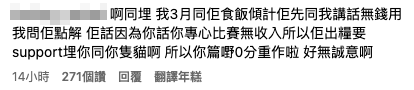 另外又有疑似Jessie的朋友留言「我3月同佢食飯傾計佢先同我講話無錢用,我問佢點解?佢話因為你話你專心比賽無收入所以佢出糧要support埋你同你隻貓啊!所以你篇嘢0分重作啦!好無誠意啊!」再次指出Nathan講大話,之後也出現幾位疑似Jessie的朋友的留言。
