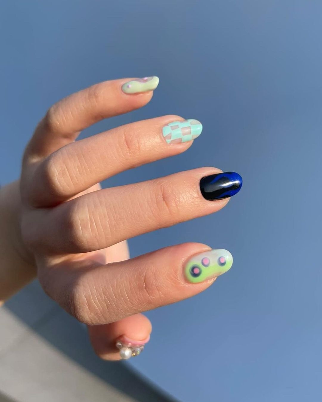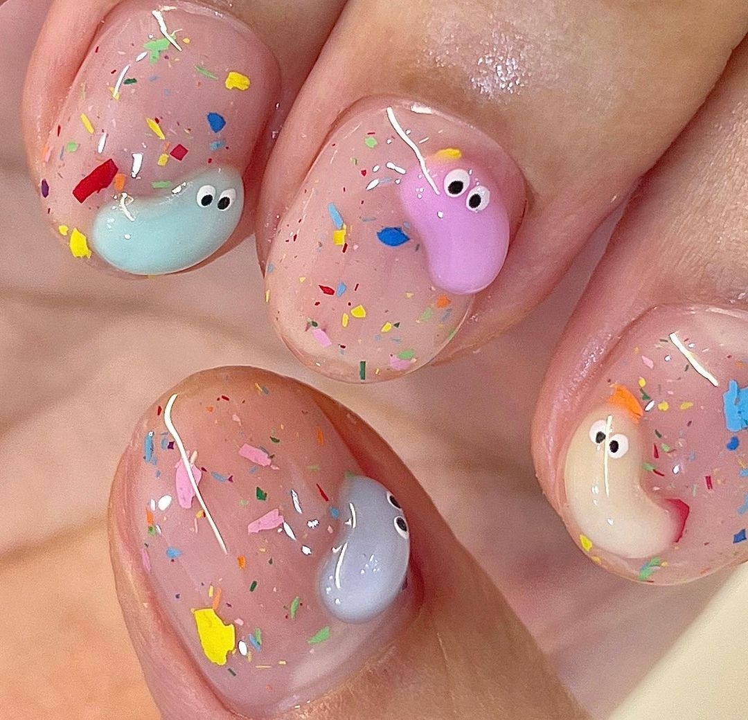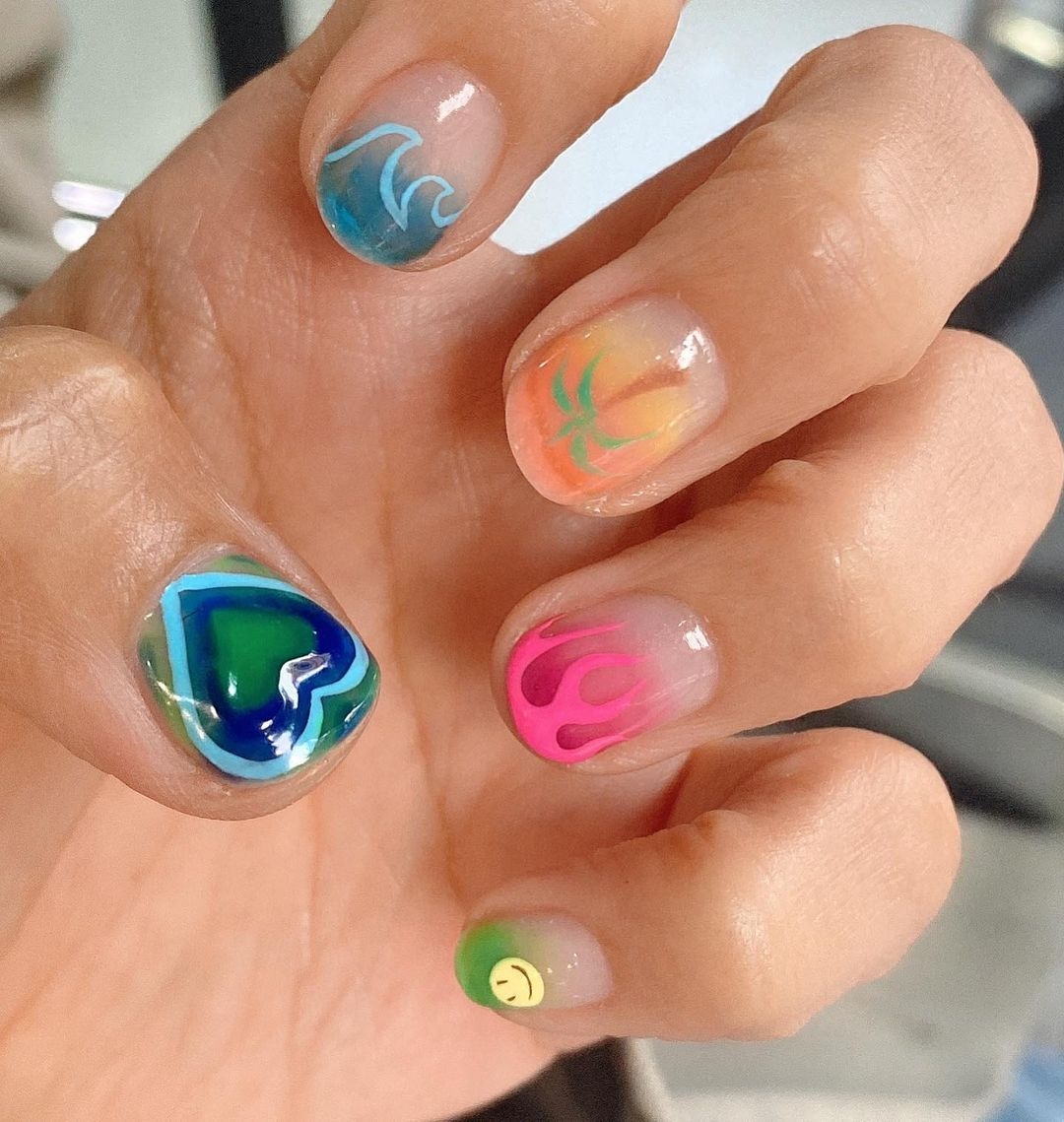 Y2K就是所謂的叛逆時尚,所以也可以揀在指尖上隨意發揮,用飽和度低或是透明色當做底色,然後把指尖當做畫板隨意塗鴉,可以是可愛笑臉,也可以是只是不規則的線條看,再配上繽紛色彩的,簡直就是千禧少女風!
