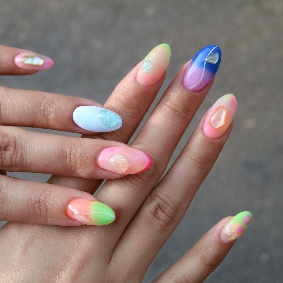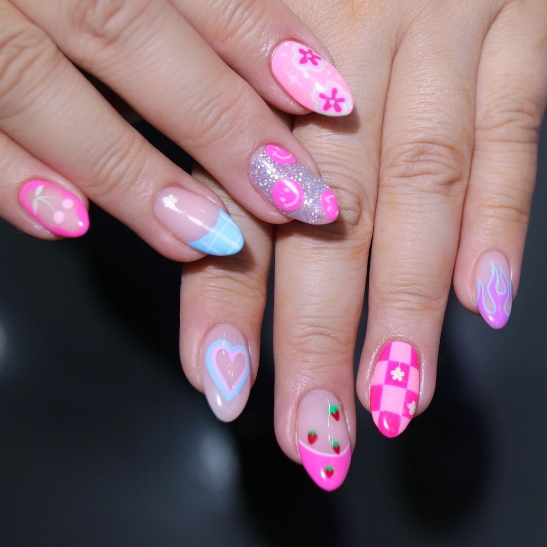 Y2K本身帶著大膽創新的意思,越是覺得不可能搭配起來的顏色,越顯得毫無違和感,和現在最流行的多巴胺美甲概念相似,就是使用搶眼,五彩繽紛的顏色進行配色,可以揀在每一個指尖上都畫上不同高飽和度或是帶點螢光的色系,時尚又型格!
