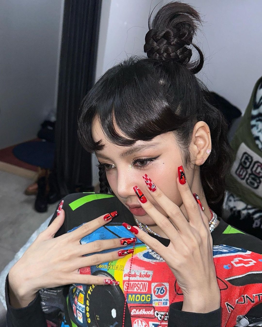 我們都知道Y2K是源自2000年初,少不了色彩誇張但又有滿滿童稚趣味的配飾,像是愛心、棋盤格、小花朵等等,連Lisa都愛!這些元素就算是放到美甲上也是毫無違和感,還會讓人有一種可愛童真的感覺,不但減齡,還不失設計感!你也可以學學Lisa 用紅黑色撞色,會讓你看起來又甜又辣!