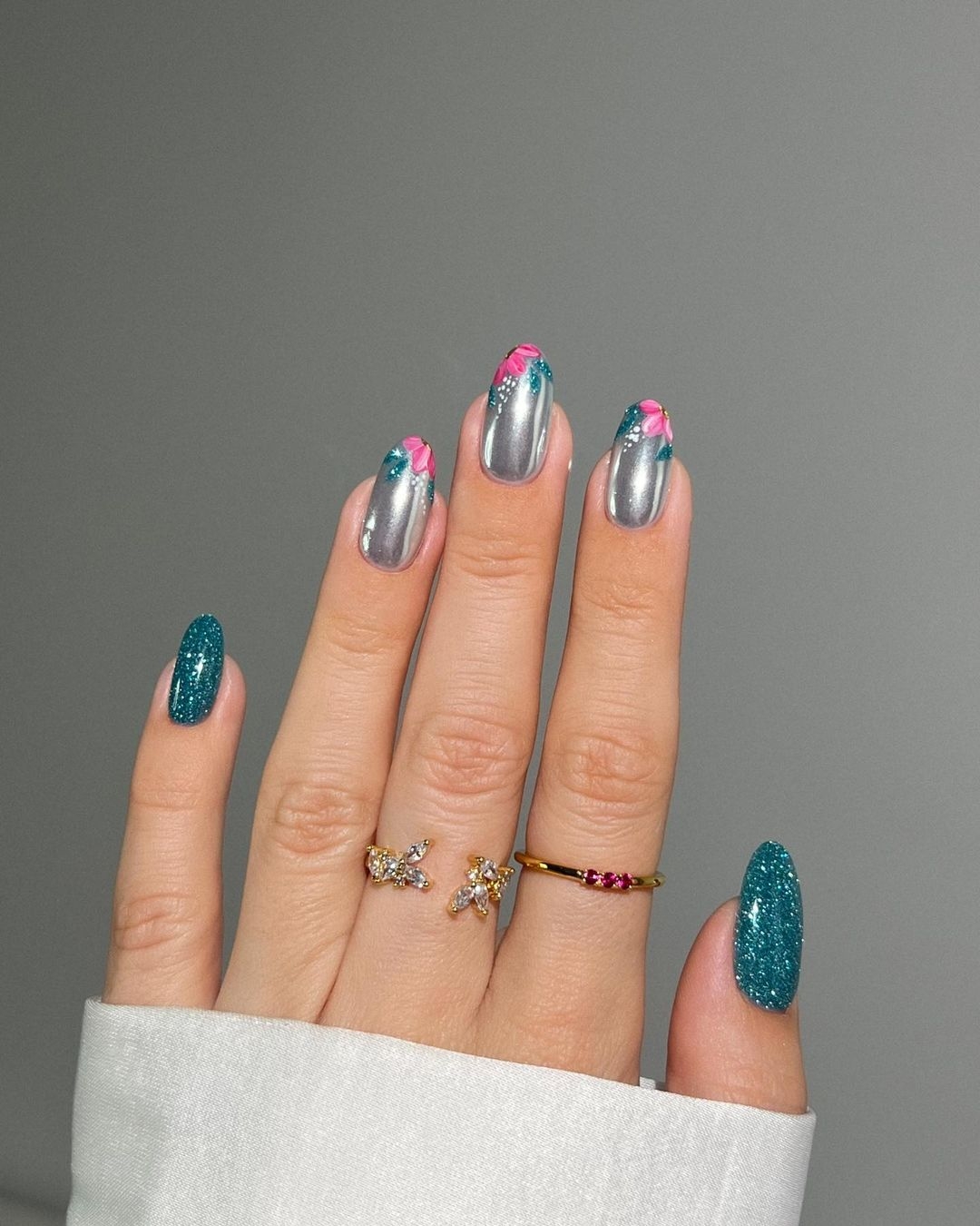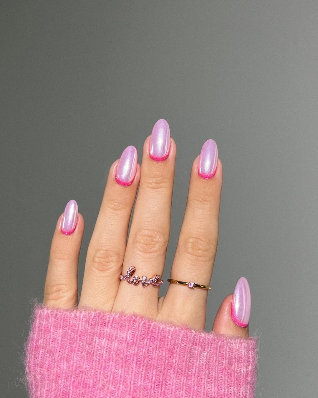 在千禧年到來的期間,因為網路帶來的未來感,所以Y2K總是會出現一些金屬元素,所以想要更顯得更Y2K,可以試試帶有金屬感的美甲款式,銀色金屬光感帶有鏡面的感覺,非常前衛,而且也超級顯白,是個性女孩的必備!如果想要增加一點少女感,可以使用粉色打底,這樣會更加顯得青春活力哦!