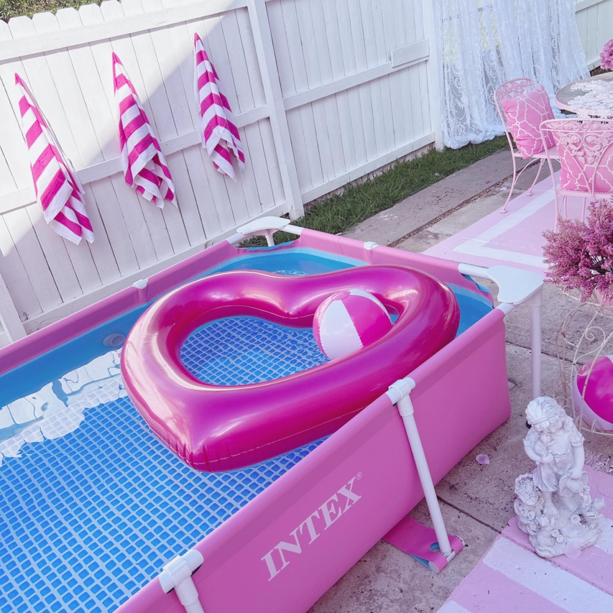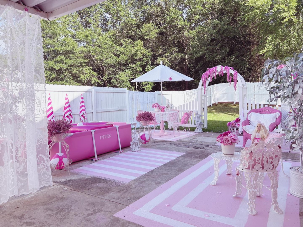 最近她又在家中的花園自製了一個粉紅泳池,配上愛心水泡,旁邊又放了太陽傘及粉紅色的椅子,在家中都能有度假的感覺。而她也特意在屋外設置了一個真人尺寸的「芭比展示櫃」,讓自己及客人打卡。