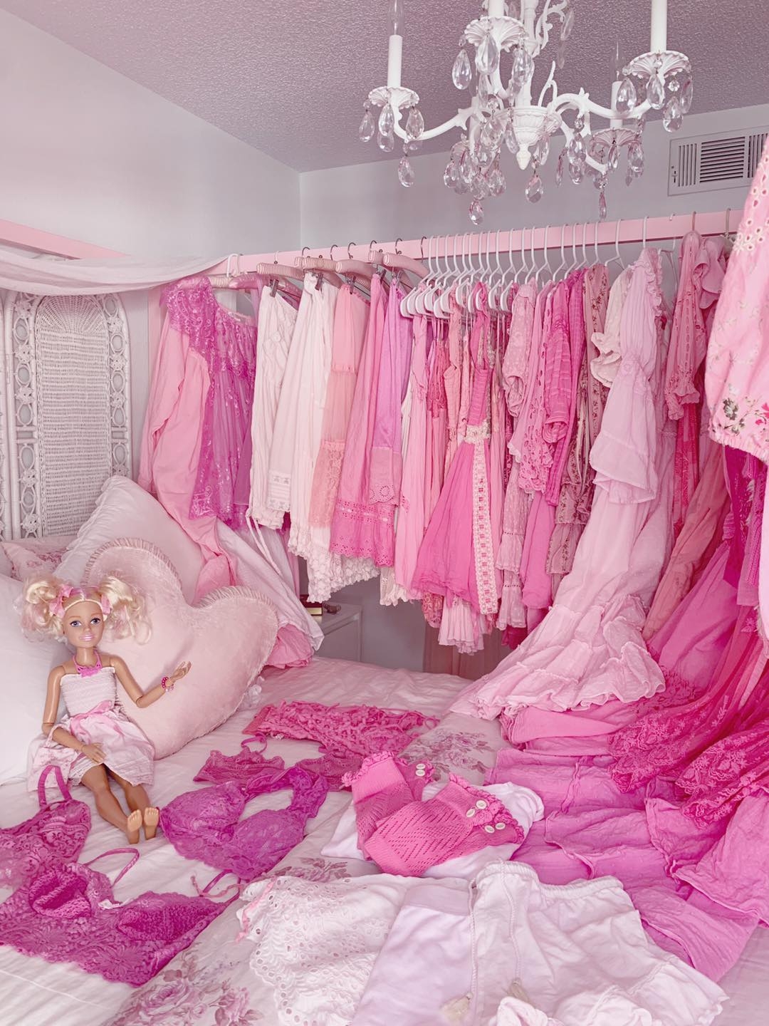 Dena將自己的房子外牆油成粉紅色及白色,打造成粉紅色芭比大屋,衣櫃裡的衣服都是粉紅色,而且所有家具及電器都是以白粉配色為主。