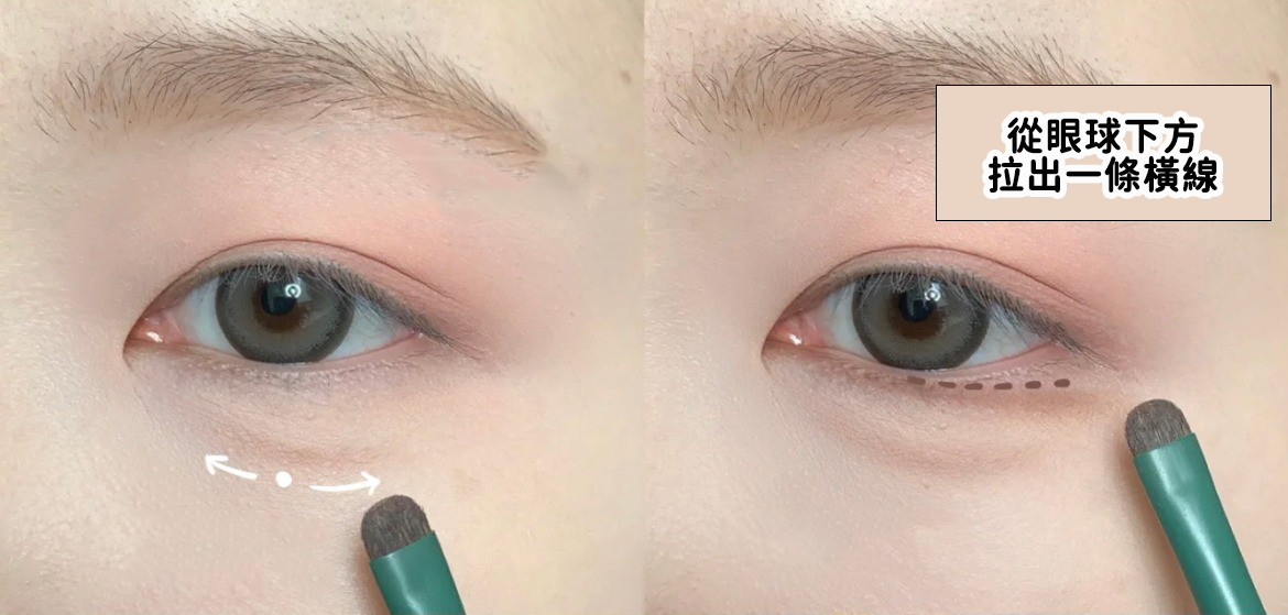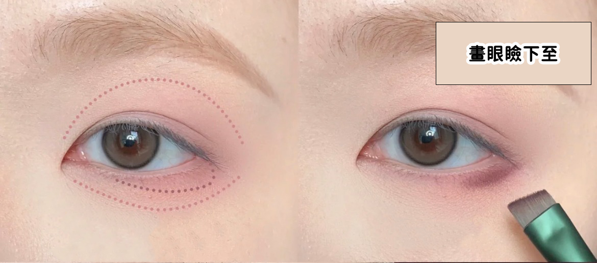 先使用蜜桃色眼影在上眼皮打底,再沾取極少量的啡色眼影在眼珠正下方的位置左右暈開,加深臥蠶陰影,再沾取啡色眼影從眼球下方拉出一條橫線,空出留白範圍,再畫眼瞼下至。