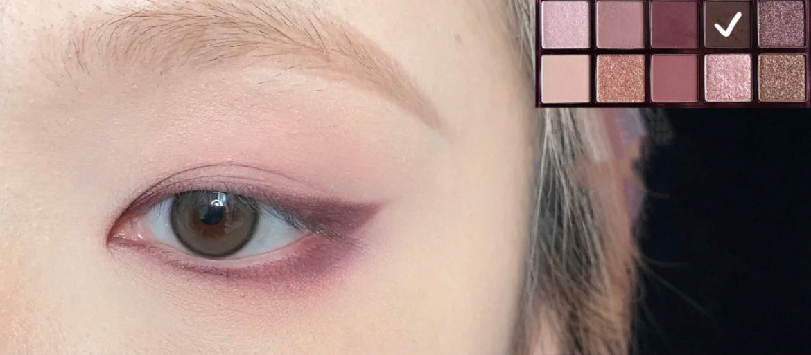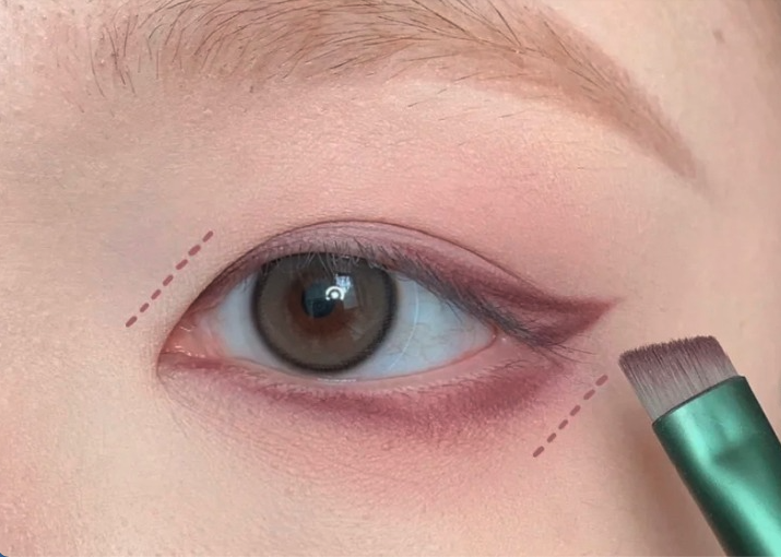 之後使用啡色眼影畫下眼線,再使用斜角眉掃沾取乾燥玫瑰色畫眼瞼下至,可以精準地畫上長直線,第一筆先在眼尾處畫斜線,第二筆再在眼珠下方畫斜線 。