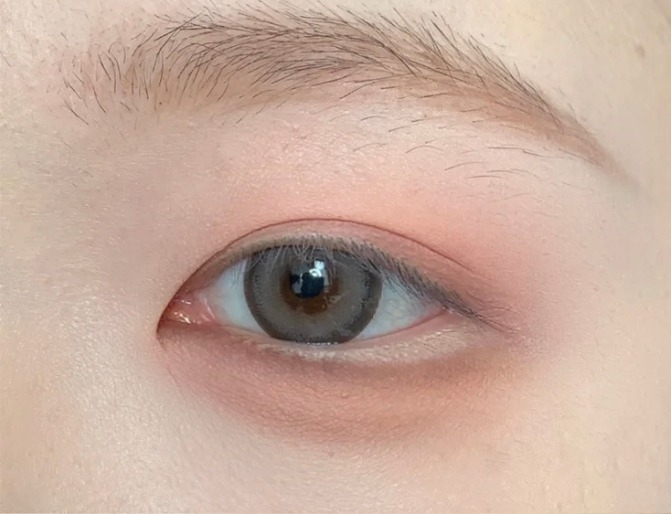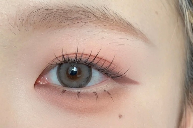 之後在整個臥蠶位置塗抹蜜桃色眼影,再順著眼型,使用啡色眼影畫上一條偏下垂的眼線,最後貼上假睫毛就完成了!