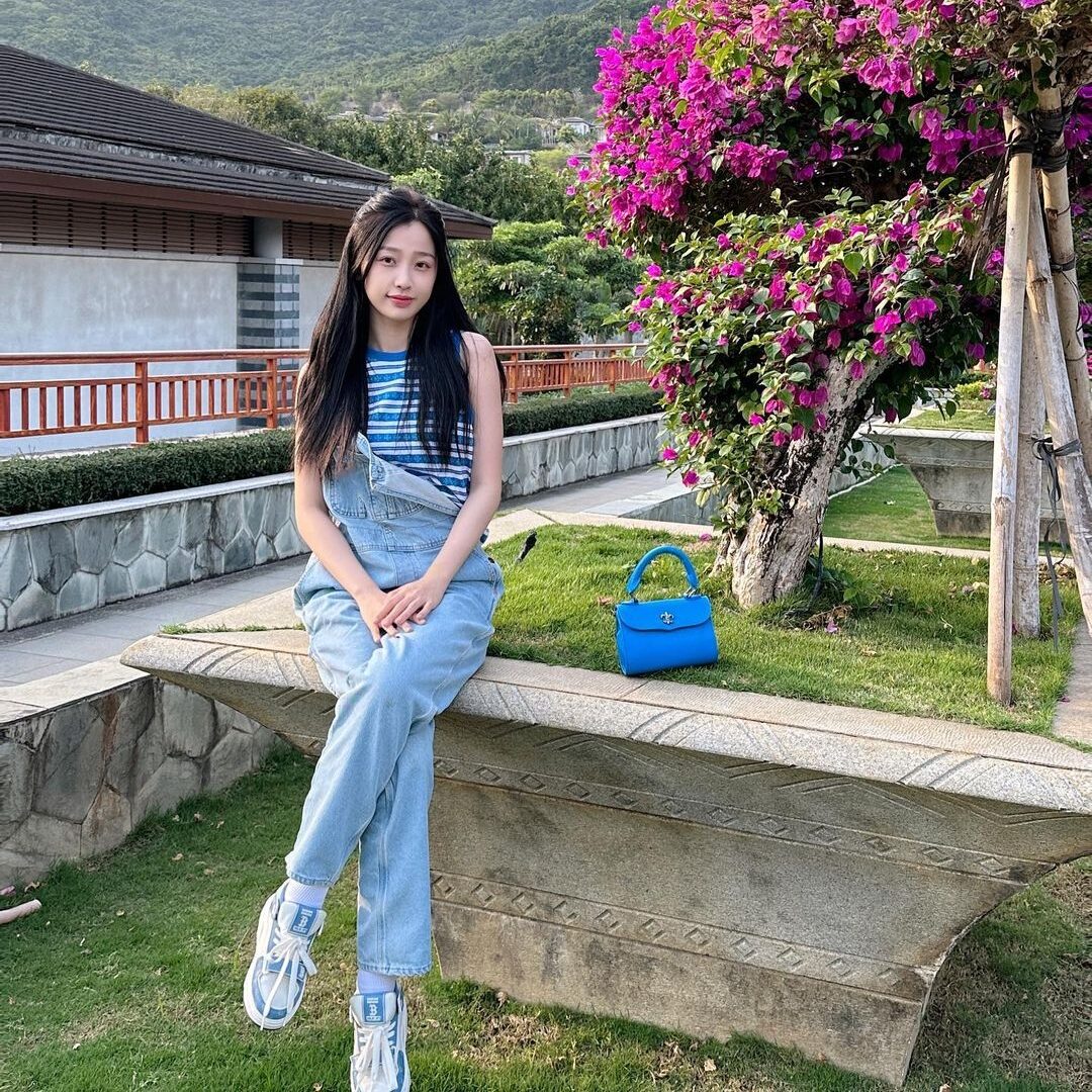 有時想不到怎樣搭配的話也可以以同色調穿搭,絕對不會出錯!以不同的深淺和質地的同色系單品來混搭,輕易著出時尚感~像她一樣藍白背心配一件牛仔連身褲,再襯一個藍色手袋,清爽感十足!