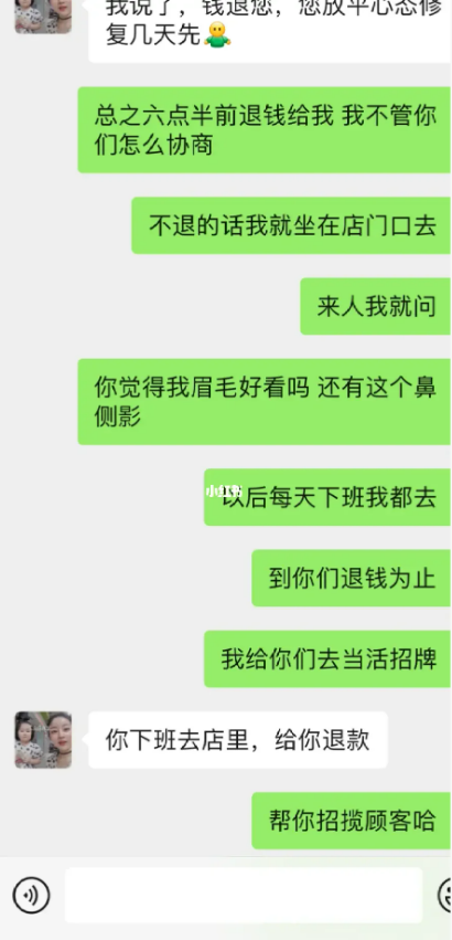 事主回家後越想越氣,紋的鼻影彷彿是兩把尺在自己的臉上;其後事主再回到店內與職員協商退款賠償,店家卻拒不賠償,甚至威脅事主撤訴:「就算工商管理局來了也不怕。」還調侃事主就是想要錢。事主直斥在協商過程中,店家態度敷衍,全程笑嘻嘻的;而負責紋鼻影的紋繡總監自始至終都沒有出現過,從沒承認自己的操作失誤。