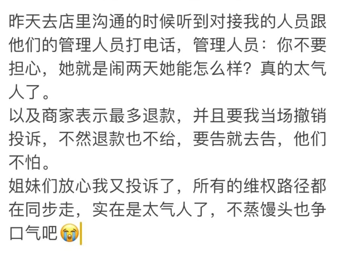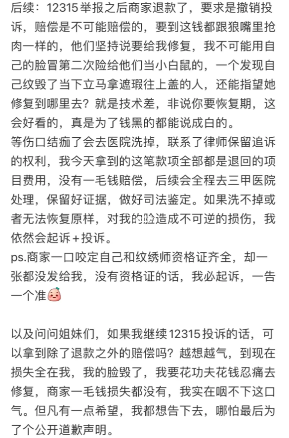 事主在無奈之下只好求助「全國12315」投訴平台,在公安的介入下,店家就指恢復期間效果不準確,又認為整個療程是在事主同意下才做的,並沒有強逼她。最後在事主的極力維權下,店家將人民幣$15,000退回,但同時要求事主撤銷投訴。