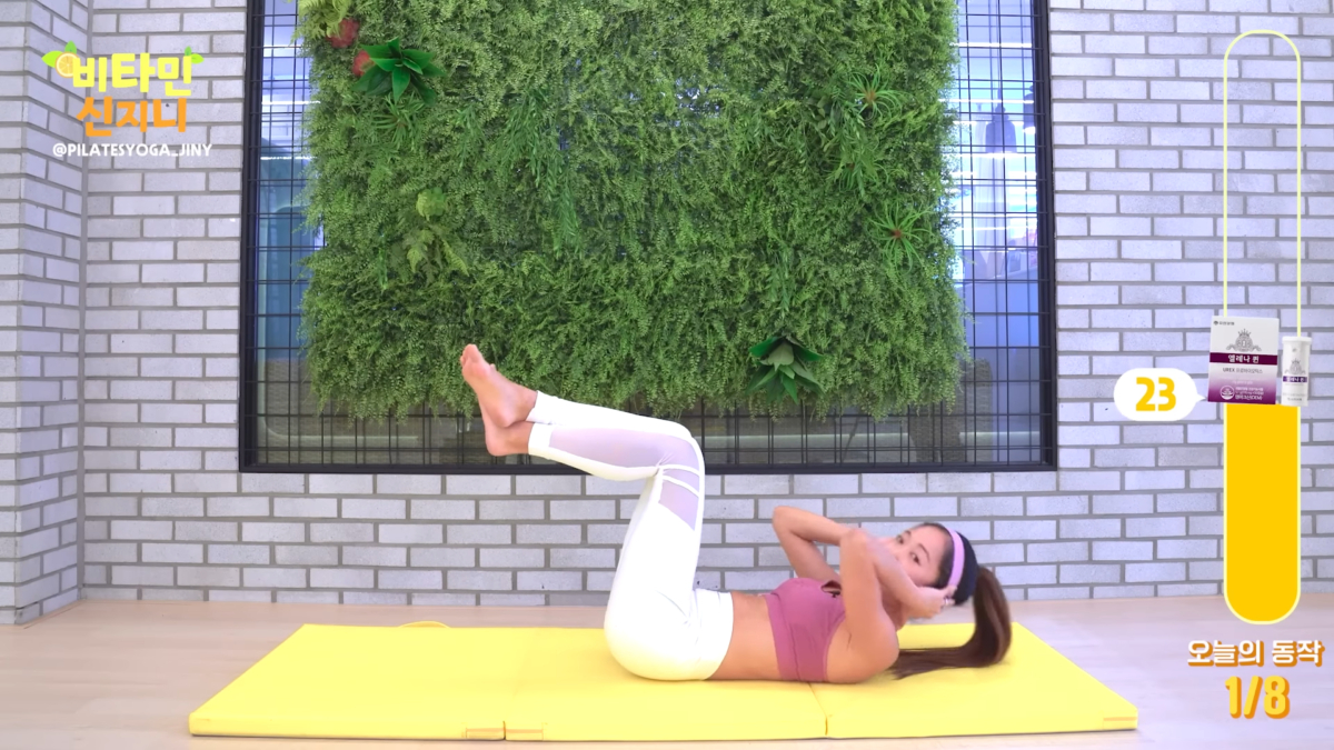 第一個動作是抬腿仰臥起坐,先躺在瑜珈墊上然後將雙腳90度抬起,之後用腹部的力量將上半身抬起,反覆動作需要維持60秒。JINY提到這個動作要注意的是,不能只抬起頸部,需要將肩膀抬起,盡量向腿部方向靠近。