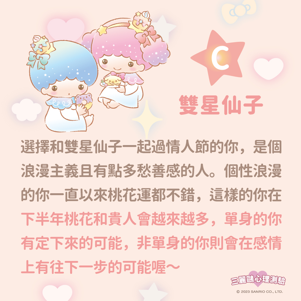 選擇Little Twin Stars的你其實一直都有桃花運,而且自帶浪漫性格的你令你好容易就和人打成一片,加上和善溫柔的性格,自然也會受到來自很多人的喜愛咯~所以下半年的你愛情運勢很好,如果是單身的話,就有機會出pool;而有了對象的你可能也會有踏入下一步的可能。