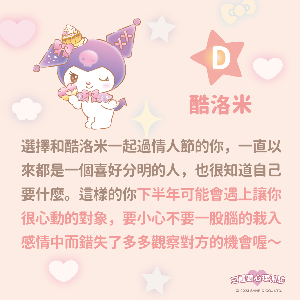 選擇Kuromi的你一直都知道自己想要的是一段什麼樣的感情,就好似Kuromi一樣很勇敢面對自己的人,因為你不喜歡虛幻不真實的東西,所以對於自己想要的對象都會有特定的條件。不過當你一遇到心動的人就很容易迷失自己,因為你會覺得難得遇到就應該好好把握住,反而讓你失去了觀察他的機會。