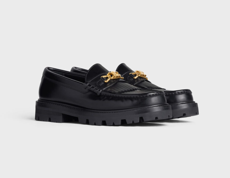 這對由公牛皮製成的CELINE 樂福鞋,以華麗的TRIOMPHE金色粗鍊帶搭配短流蘇,簡約又不失時尚感的設計,絕對值得入手一對!日常穿搭也能搭配到,充滿法式慵懶感~