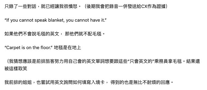 他更表示有空中服務員取笑乘客的英文:「Carpet is on the floor.」猜測是有乘客誤用Carpet(地毯)索要毛毯(Blanket)。隨後有乘客用英文詢問如何填寫入境卡的時候,該網民指空中服務員也是不耐煩的回應。