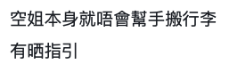 不過港女稱該空姐竟然回答她:「你可能要自己搵個男士幫你,因為我都好矮幫唔到你」令到該網友一時來不及反應,但幸好有位男士主動幫她拿下行李。港女就在貼文中寫道:「想問一下做空姐唔係要度過夠唔高拎行李先做到?同埋點解你返工要我自己搵人幫手?唔係你叫空少幫手?咁你咪好嘆?」明顯對空姐拒絕她的請求超不滿。