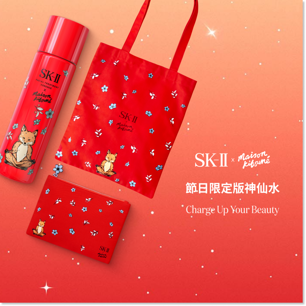 SK-II X Maison Kitsuné的節日限定版神仙水已於10月在日本和台灣率先開賣,並引來搶購潮!而SK-II X Maison Kitsuné的節日限定版神仙水將於2023年11月13日在各門市發售,聽說亦有一連串節日限定的禮遇活動~限量搶購!立即訂閱【SK-II的Whatsapp頻道】不但能獲得最快最新的產品資訊,首次綁定WhatsApp還能到店換領護膚精華和嫩膚清瑩露體驗裝(價值HK$129)!新用戶到店更可獲贈迎新禮品:護膚精華、光蘊臻采煥亮精華和SKINPOWER 致臻能量精華霜的體驗裝(價值HK$226),切勿錯過這場全新的年度療癒之旅!