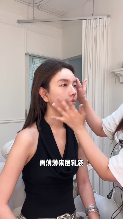 之後還一邊用力吹頭一邊上底妝,不過底妝部分還挺有自然光澤感,但淚溝、黑眼圈都沒有遮到,而且定妝後皮膚依然看起來很粗糙,令她大嘆效果比起其他美容院的體驗差很多。