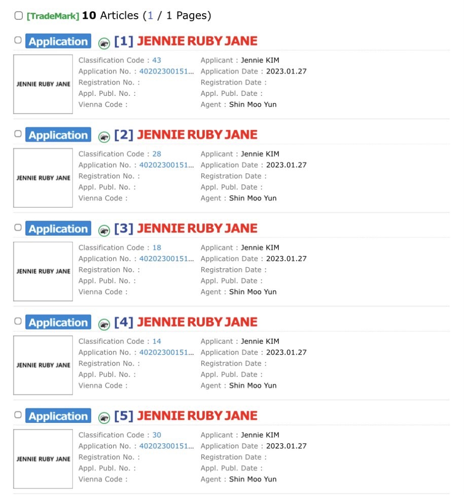 BLACKPINK與YG娛樂公司的合約早在今年8月到期,如今以過去3個月,仍遲遲未宣佈4人的續約情況。然而在續約未明朗的情況下,近日又被發現Jennie用自己IG名字,似乎悄悄地向韓國專利局申請了「Jennie Ruby Jane」的商標,當中涉及的類別包括音樂、媒體,品牌、服裝、美妝,似乎未來準備向這幾方面業務發展。