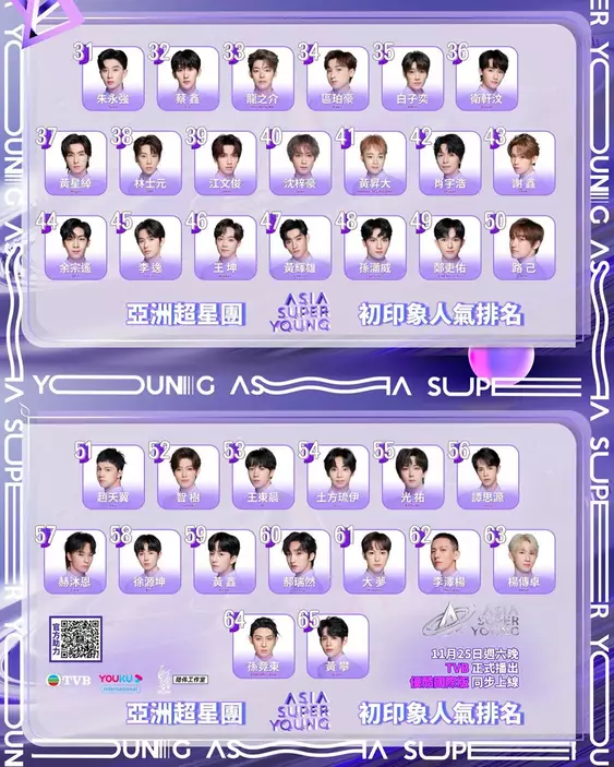 而最終「初印象人氣排名」頭10位分別是奧利、李權哲、譚奕天、鐘駿一、陳鑫昊、尹俊嵐、冼靖峰、張勝希、張鎬濂和江信熹。其中香港代表冼靖峰、張鎬濂分別排名第7和第9名,人氣不俗~而由演員轉型為歌手的丁子朗則排名第21位,其餘香港代表分別為第18位的文佐匡、第20位的黃奕斌、第26位的方玉亨、第34位的區珀豪、第37位的黃星綽和第44位的余宗遙。