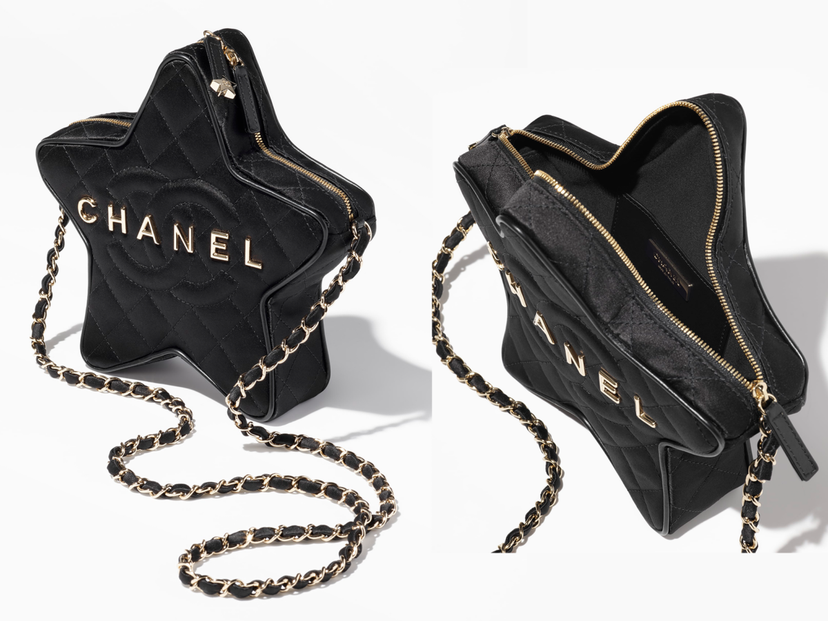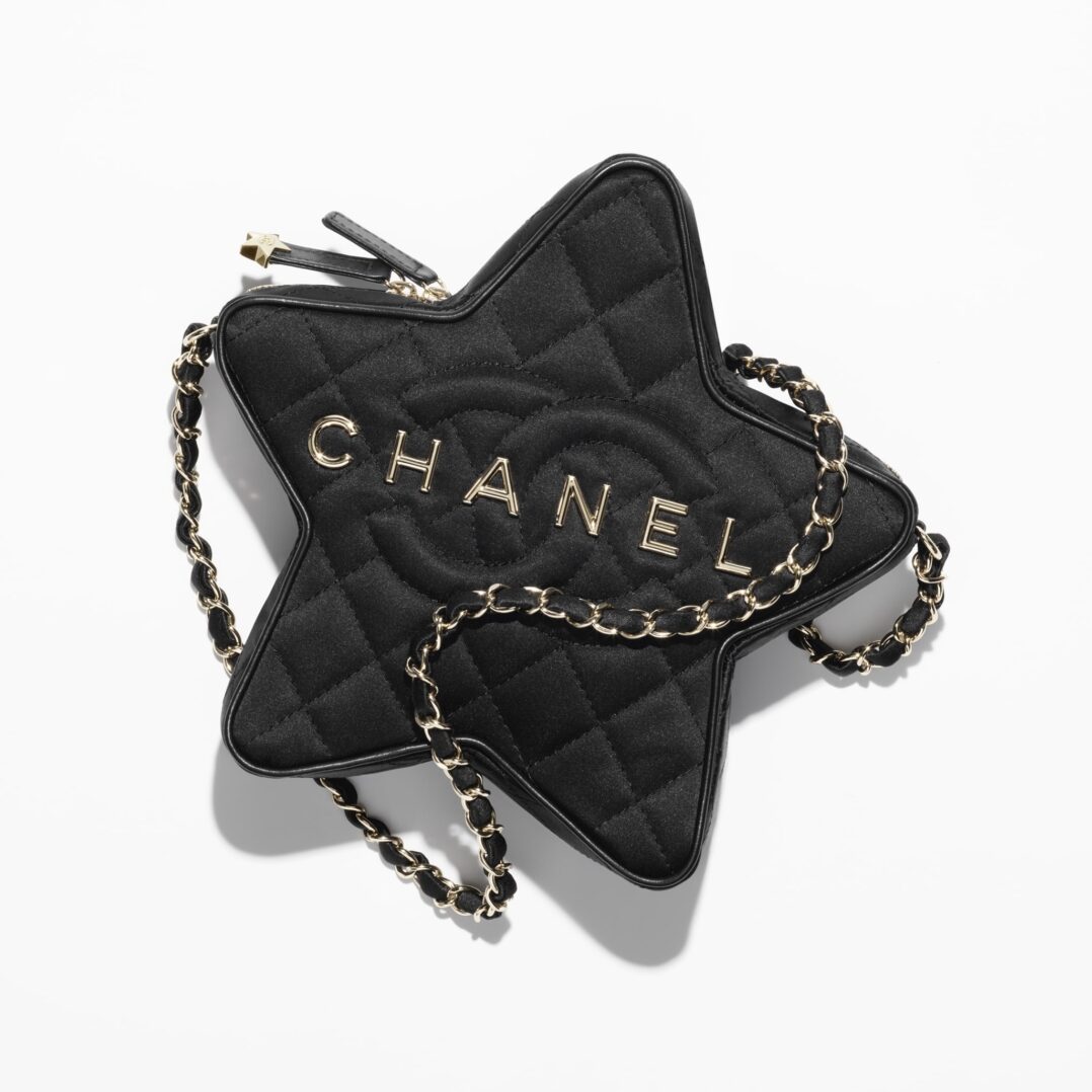 CHANEL在2023/24早春度假系列時裝展就展現了最新的星形手袋,以黑色絲緞質地為主,配合菱格壓紋,中間除了鑲有金色的CHANEL Logo,還有低調、立體的「雙C」托底,光是外型已經很可愛又吸睛,加上黑金的配色的皮穿鏈,超有質感~想再浮誇一點還可以選擇金、銀色。