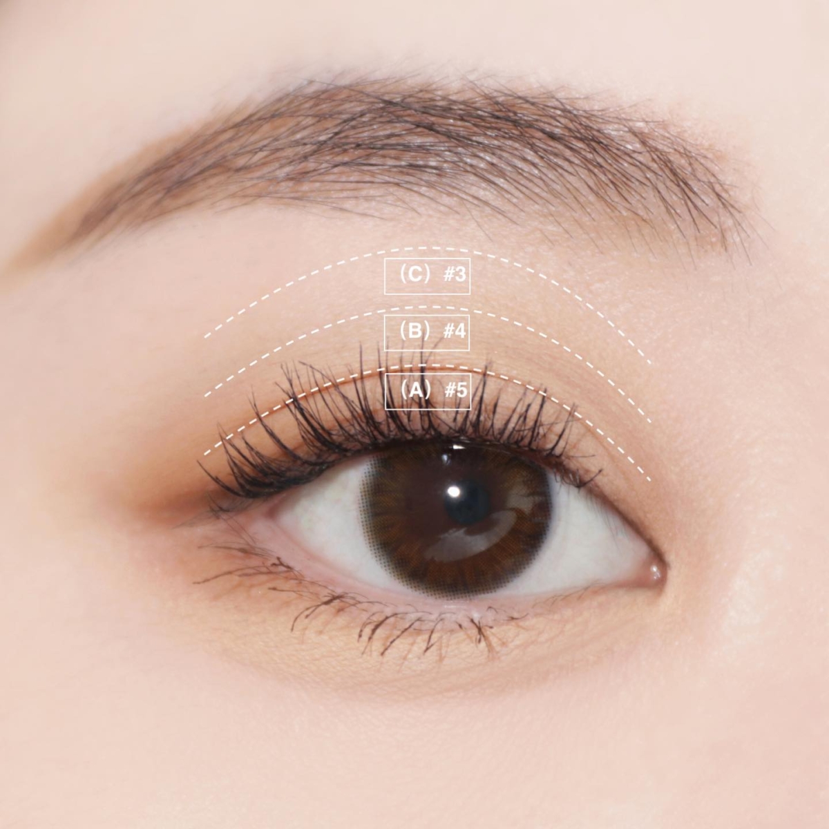 之後依照次序由深到淺慢慢疊加,有助達到消除眼腫和放大雙眼的效果~在(A)睫毛根部位置開始用「第5階」橫掃畫至眼皮褶線位;再用「第4階」畫在(B)眼皮褶位至眉毛下緣的1/2處;最後用「第3階」由在(C)1/2處畫至眉毛下緣。