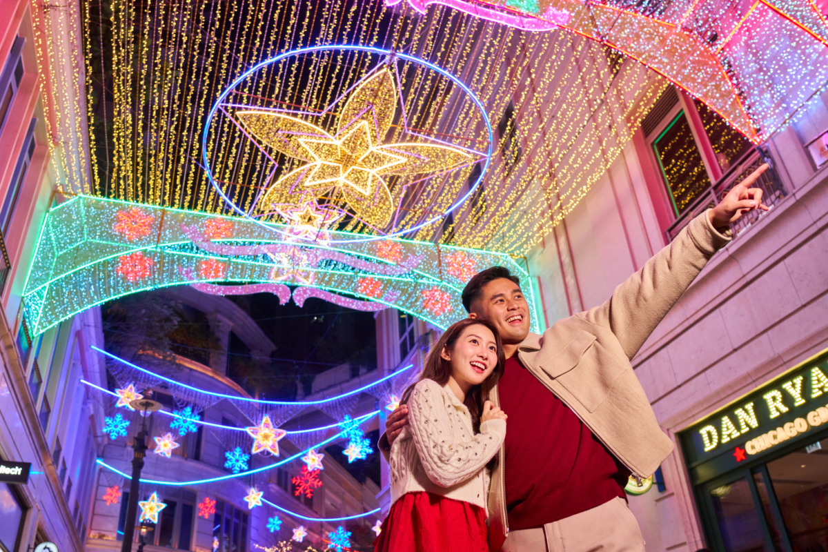 利東街今年推出 「The Wishing Stars」聖誕藝術裝置,以逾百萬顆七彩寶石打造200 米的星鑽許願長廊,以及位於中庭上空的五米「巨型許願星」,四周以大大小小的雲彩及流星橋點綴,製造出強烈的立體感,拍照打卡超夢幻!