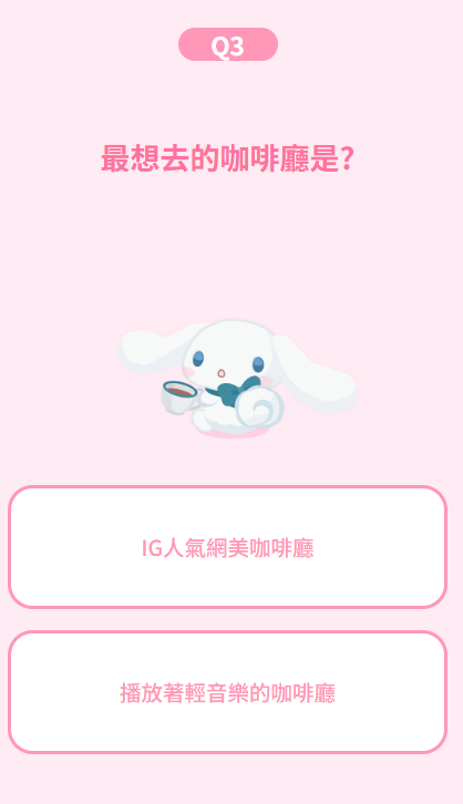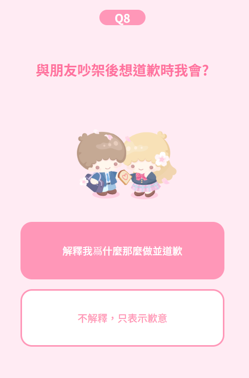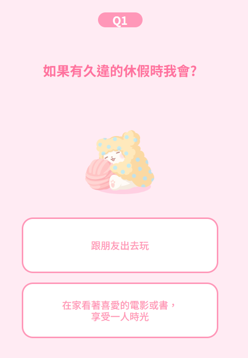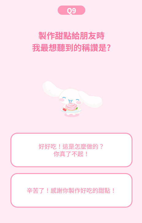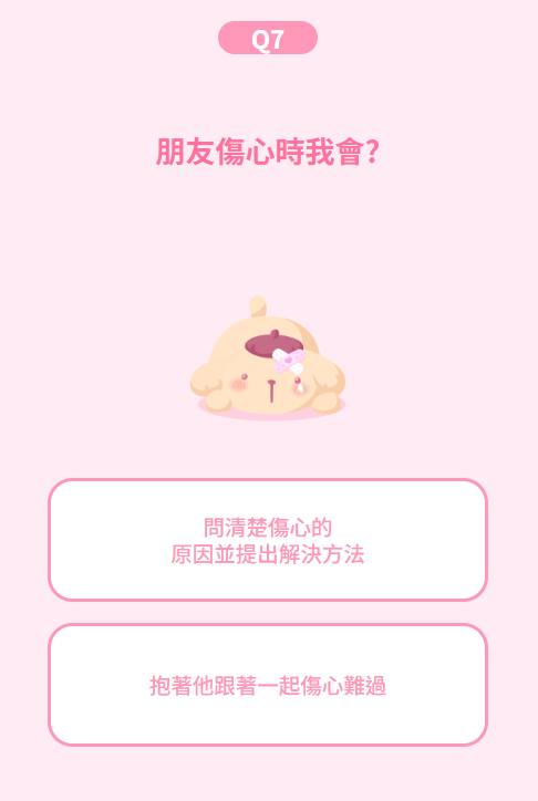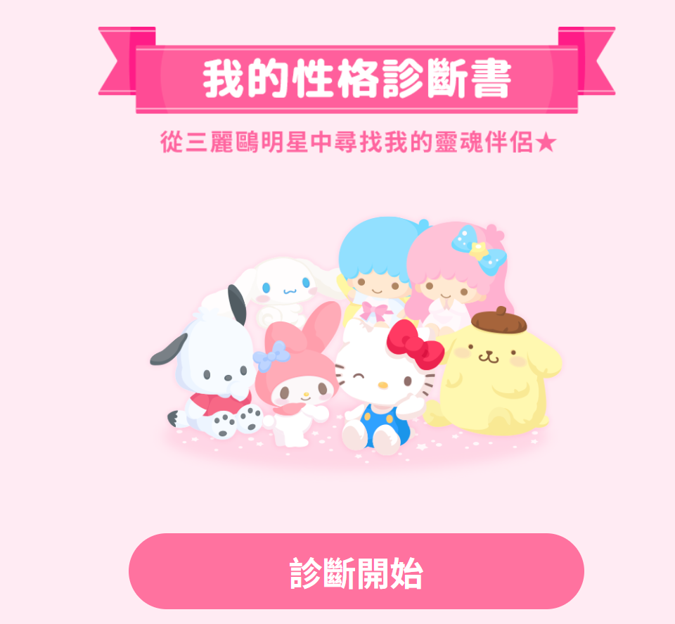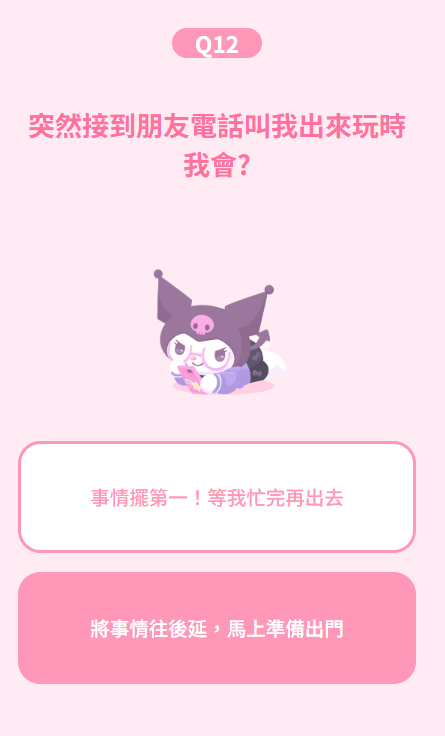 今次這個測試不單止會測出和你最合拍的Sanrio明星,還會測出有關於你的性格分析哦~12題裡會根據你的日常生活情況進行測試,每題都會2個選擇,只要揀最符合你的情況就可以喇~一起來玩玩吧!