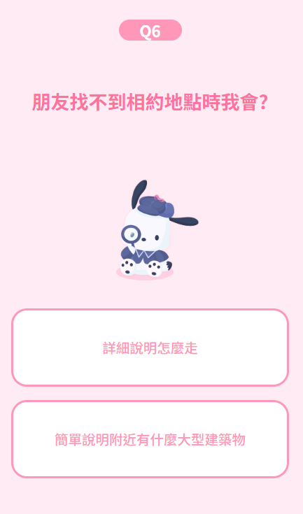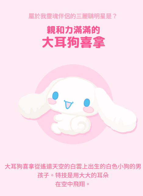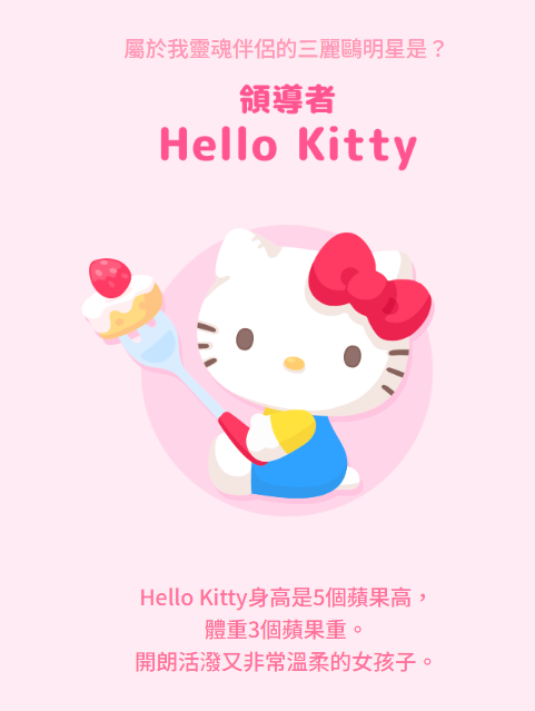 做完題目就可以即刻看答案啦!測驗結果就會根據你的回答,幫你匹配一個最合拍的Sanrio明星,例如「親和力滿滿的玉桂狗」、「領導者Hello Kitty」等等,而且也會解釋Sanrio明星們的特點,超可愛!