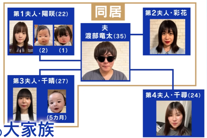 這名男子名叫渡部龍太,居住在北海道札幌市,目前擁有4名太太和2名女友,分別是22歲陽咲、年齡未透露的彩花、27歲千晴,以及目前分居中的24歲千尋。最神奇的是他還和太太們生育了9名子女。據渡部龍太表示,自己是因為單純喜歡女性才會變成如今的「一夫多妻」的狀態。