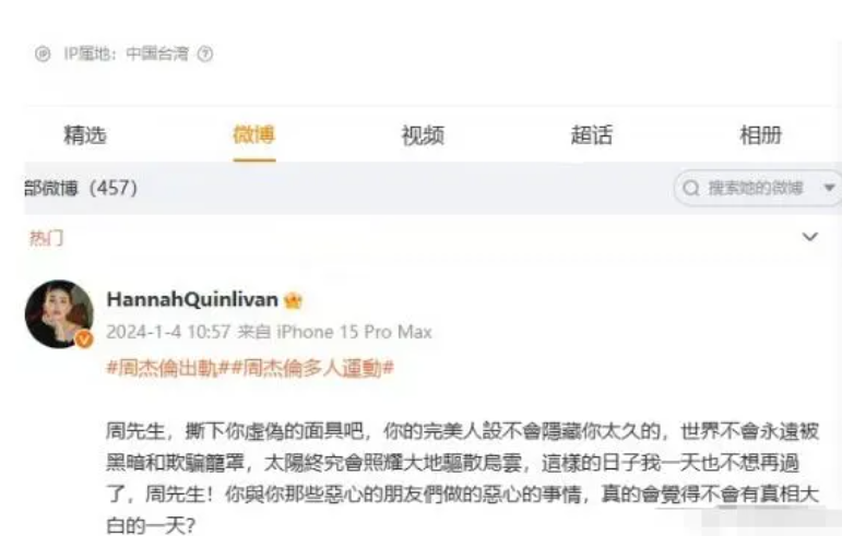 日前在網上突然瘋傳一張疑似昆凌微博發文的截圖,內容寫道「周先生,撕下你虛偽的面具吧,你的完美人設不會隱藏你太久的,世界不會永遠被黑暗和欺騙壟罩,太陽終究會照耀大地驅散烏雲,這樣的日子我一天也不想再過了,周先生!你與你那些噁心朋友們,做的噁心的事情,真的會覺得不會有真相大白的一天?」,又hashtag了「# 周杰倫出軌 」及「# 周杰倫多人運動」。