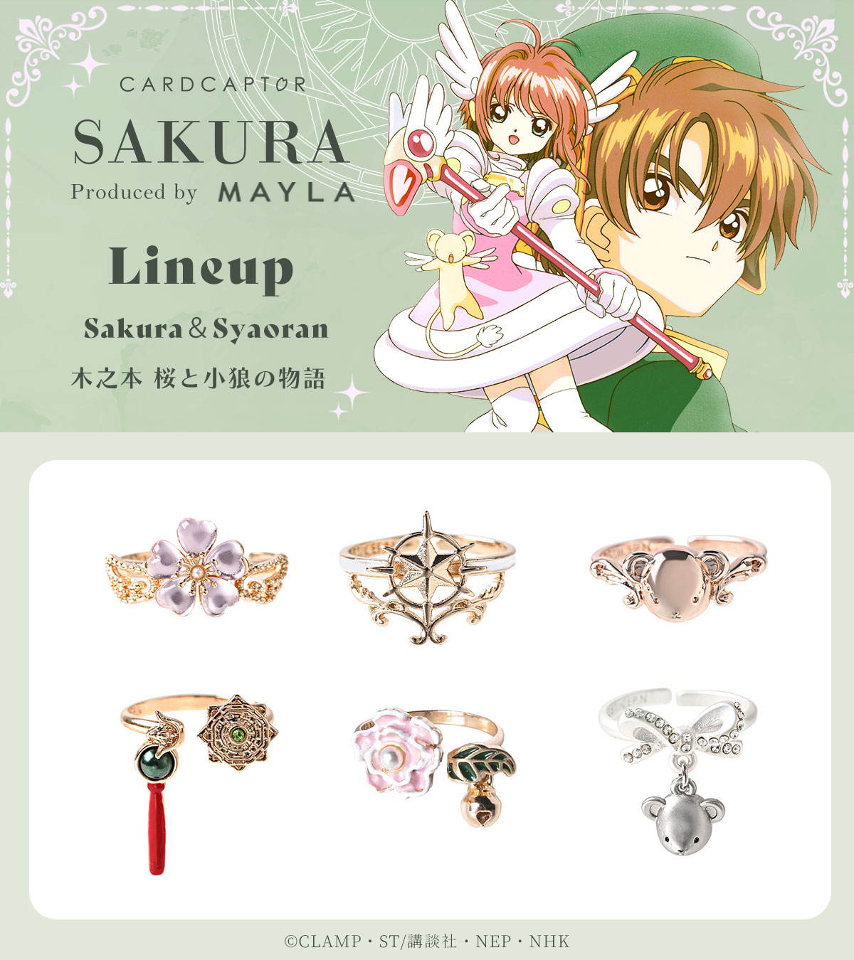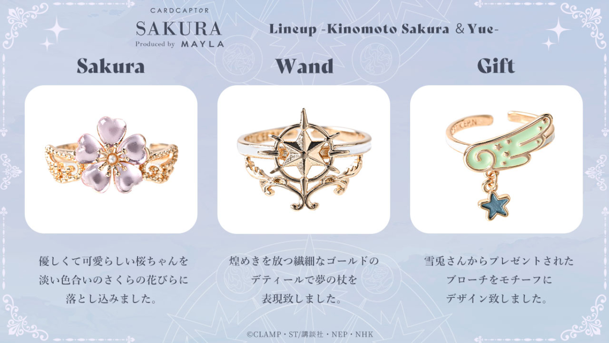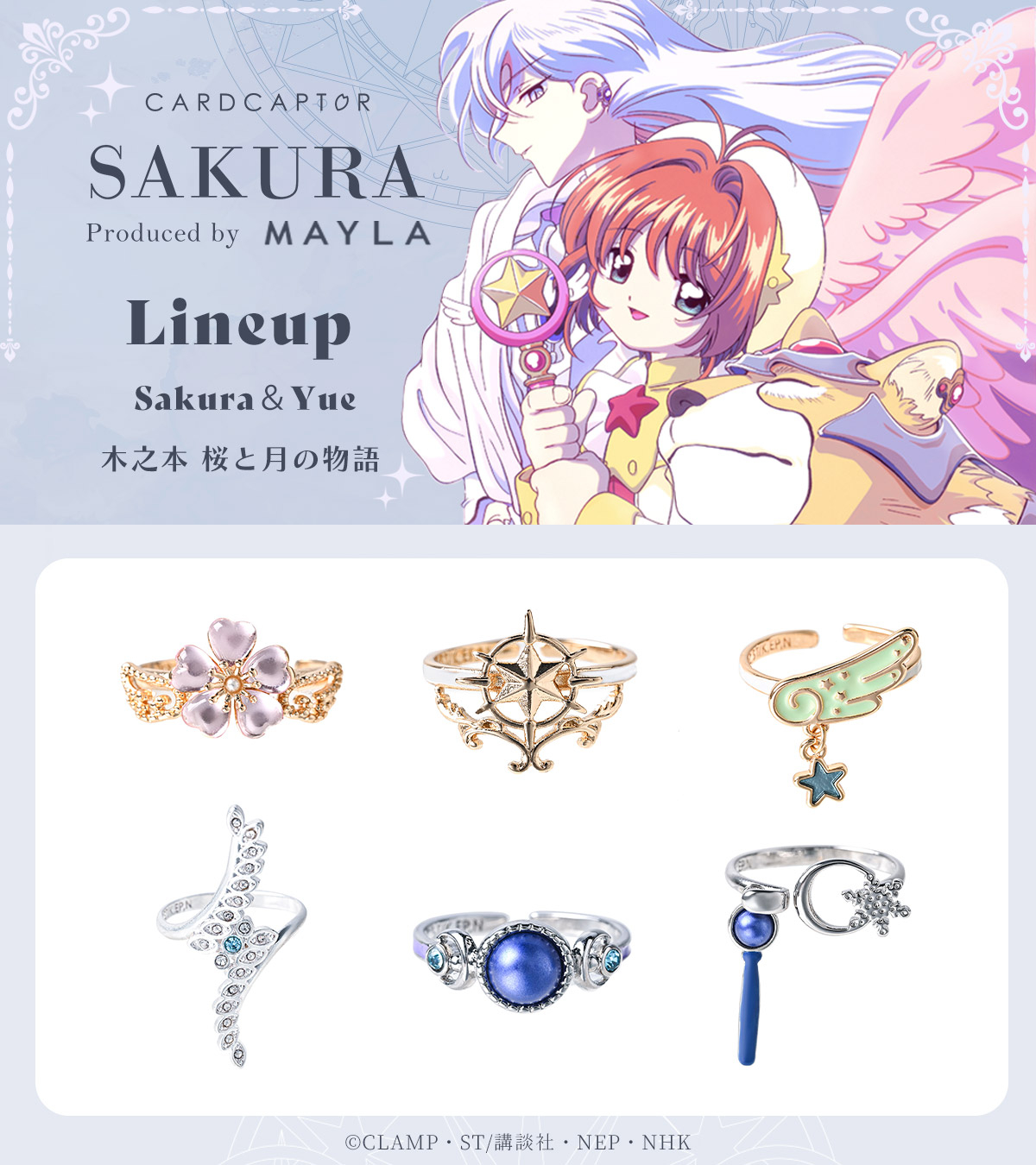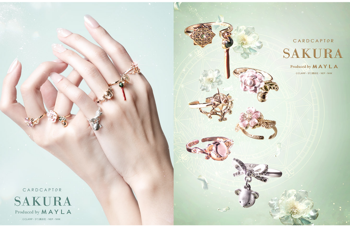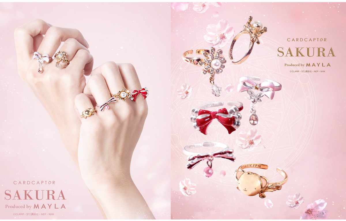 日本時尚品牌 mayla classic 與百變小櫻之前曾聯名推出過一系列的夢幻鞋款、髮夾和手杖耳環,今次第四彈以三套超靚的戒指套裝再次登場,整個系列一共有三套主題:「桜の物語」、「桜と小狼の物語」和「桜と月の物語」,每套都會有6隻不同的開口戒指,以百變小櫻故事中的一些標誌性物件為設計,超夢幻!
