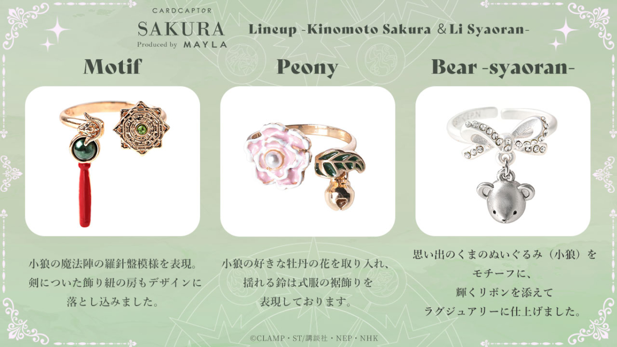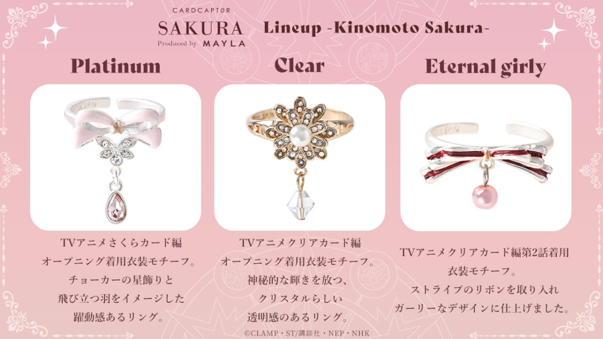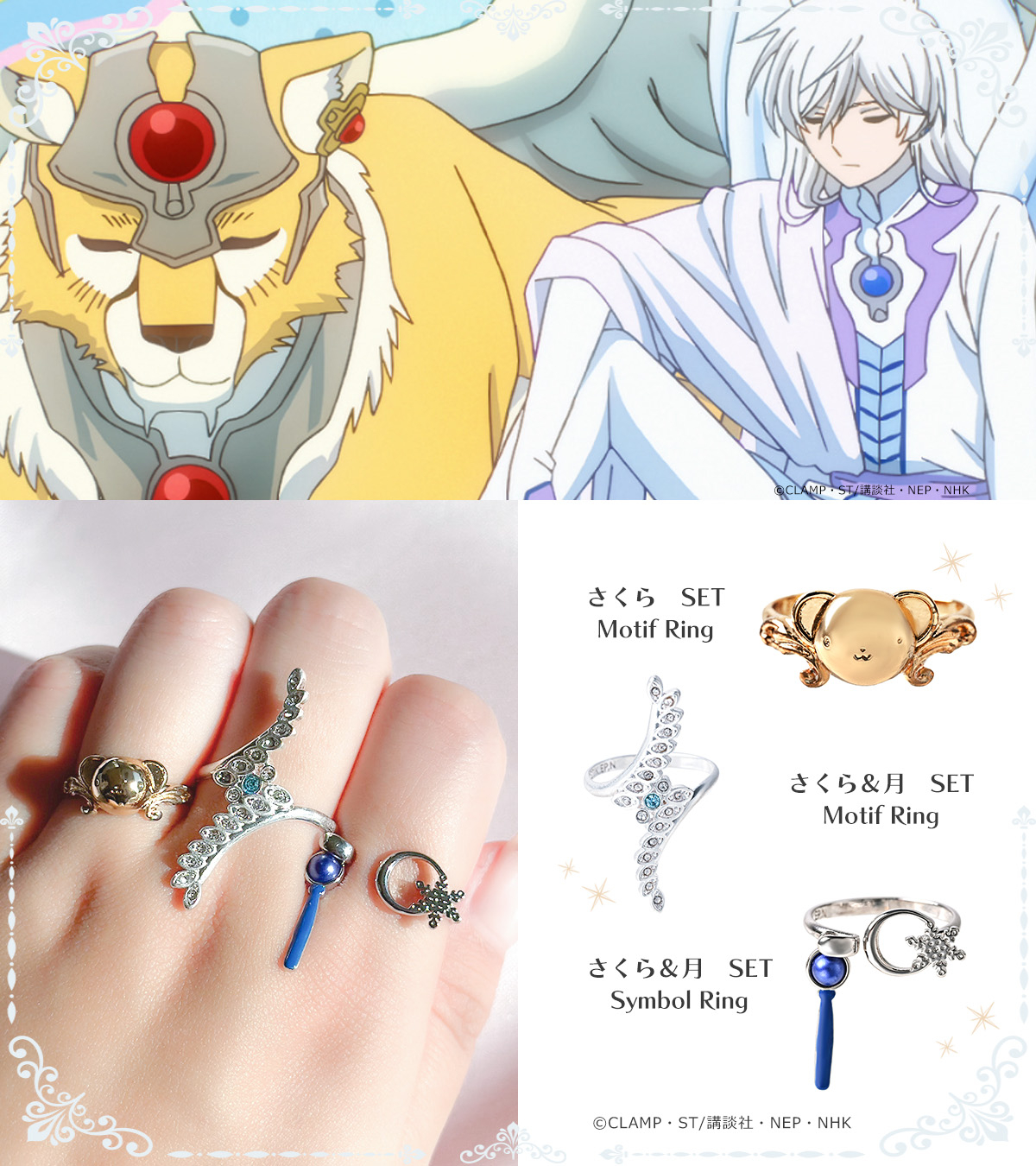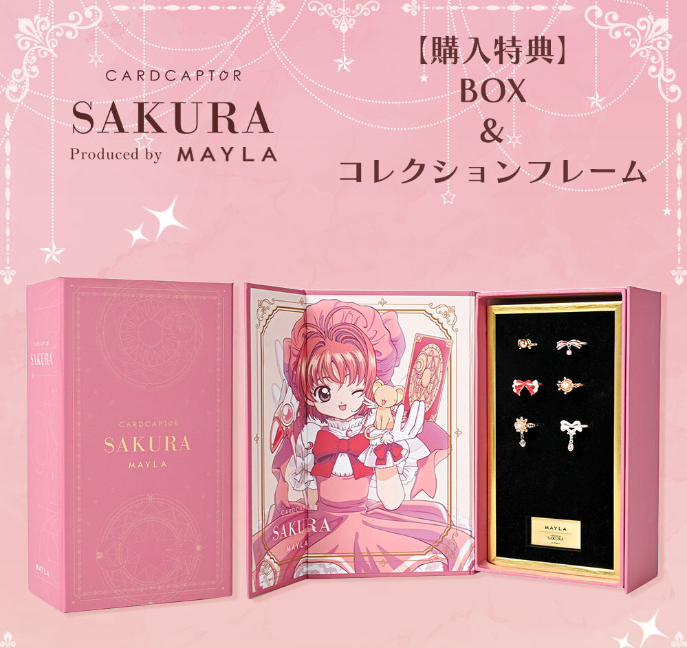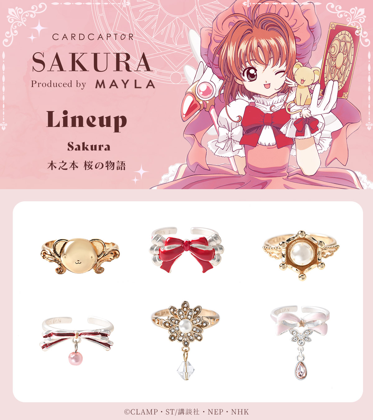 日本時尚品牌 mayla classic 與百變小櫻之前曾聯名推出過一系列的夢幻鞋款、髮夾和手杖耳環,今次第四彈以三套超靚的戒指套裝再次登場,整個系列一共有三套主題:「桜の物語」、「桜と小狼の物語」和「桜と月の物語」,每套都會有6隻不同的開口戒指,以百變小櫻故事中的一些標誌性物件為設計,超夢幻!