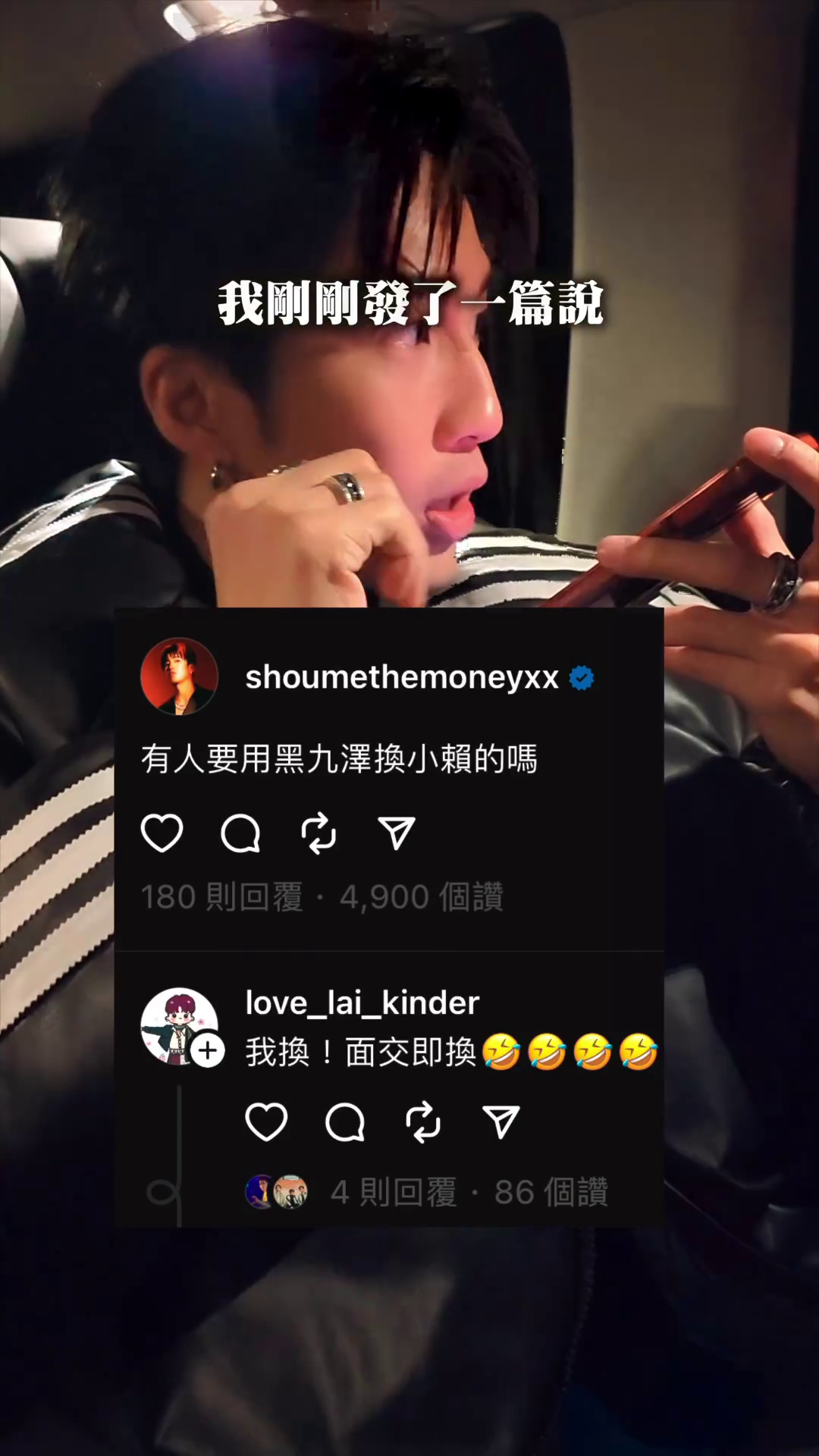 台灣男子組合五堅情由陳零九、邱鋒澤、黃偉晉、賴晏駒及婁峻碩組成,出道起就深受歡迎,當中邱鋒澤、陳零九曾經來港擔任MIRROR成員Edan演唱會嘉賓,私下有交情。近日五堅情的官方IG公開了一段影片,片中成員賴晏駒(小賴)與婁峻碩竟然為了換小卡,特意親身即日來回香港見粉絲,連Edan都超佩服!