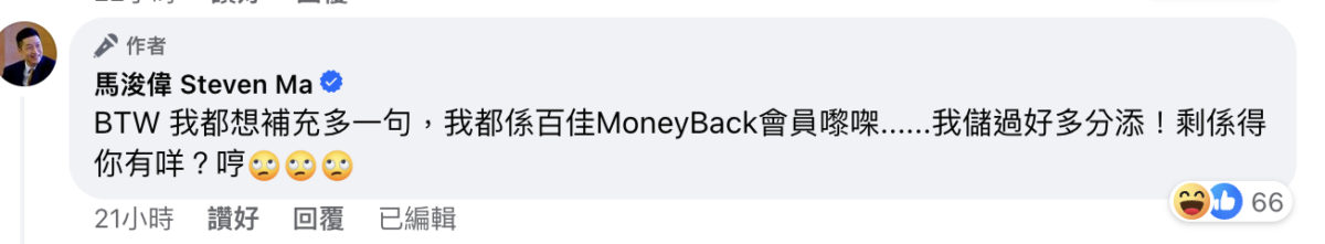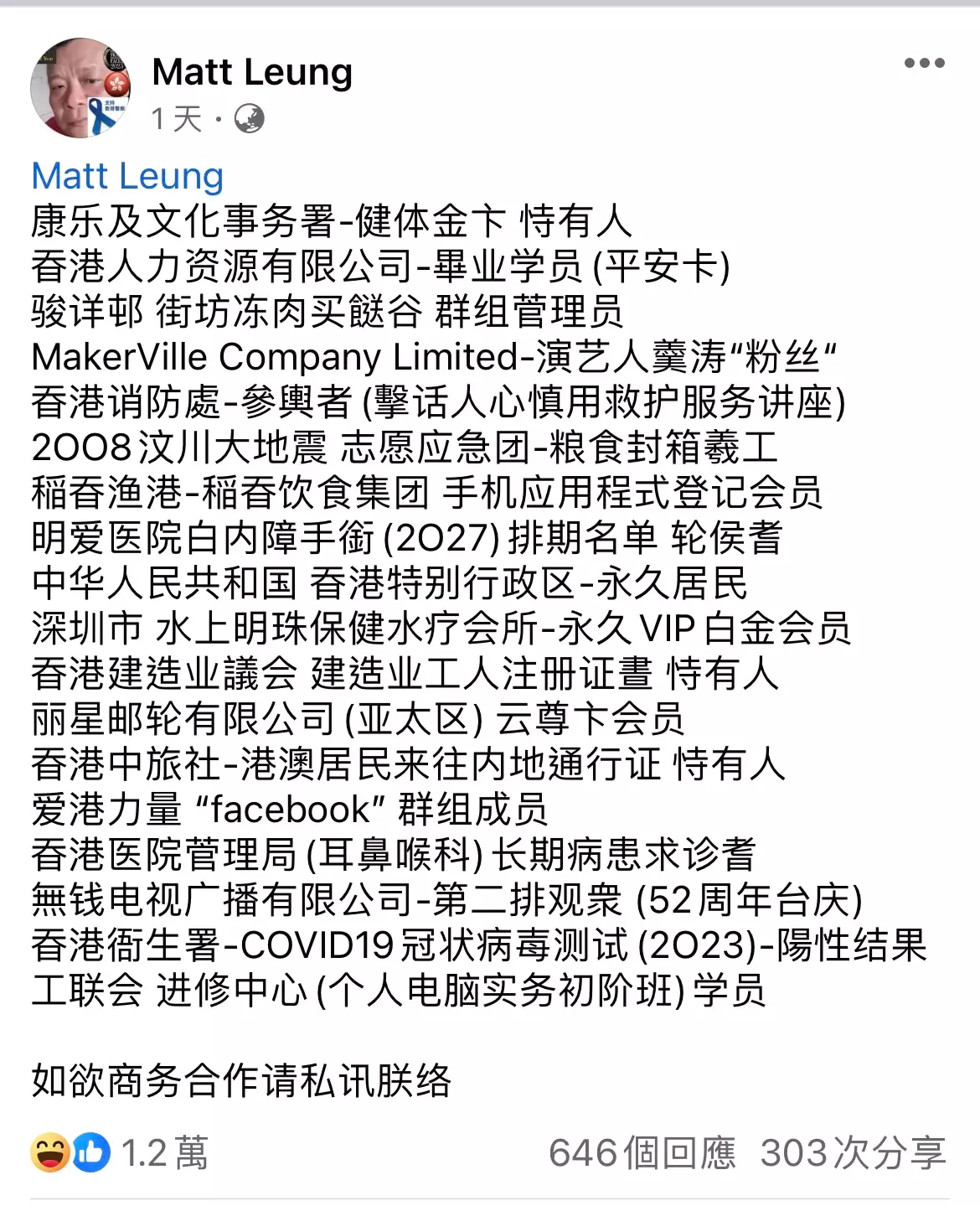 不僅網民抽水,就連KOL Matt Leung也出文挑機,超越馬浚偉曬出18個頭銜,包括「康乐及文化事务署-健体金卞 恃有人、昋港人力资源有限公司-畢业学员(平安卡)、骏详邨 街坊冻肉买餸谷 群组菅理员、MakerVille Company Limited-演艺人羹涛“粉丝“」等等,更直言自己還有很多頭銜沒寫,做人低調點比較好!