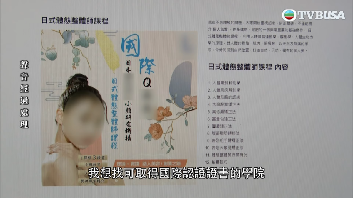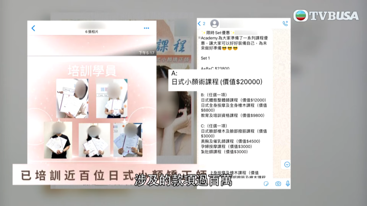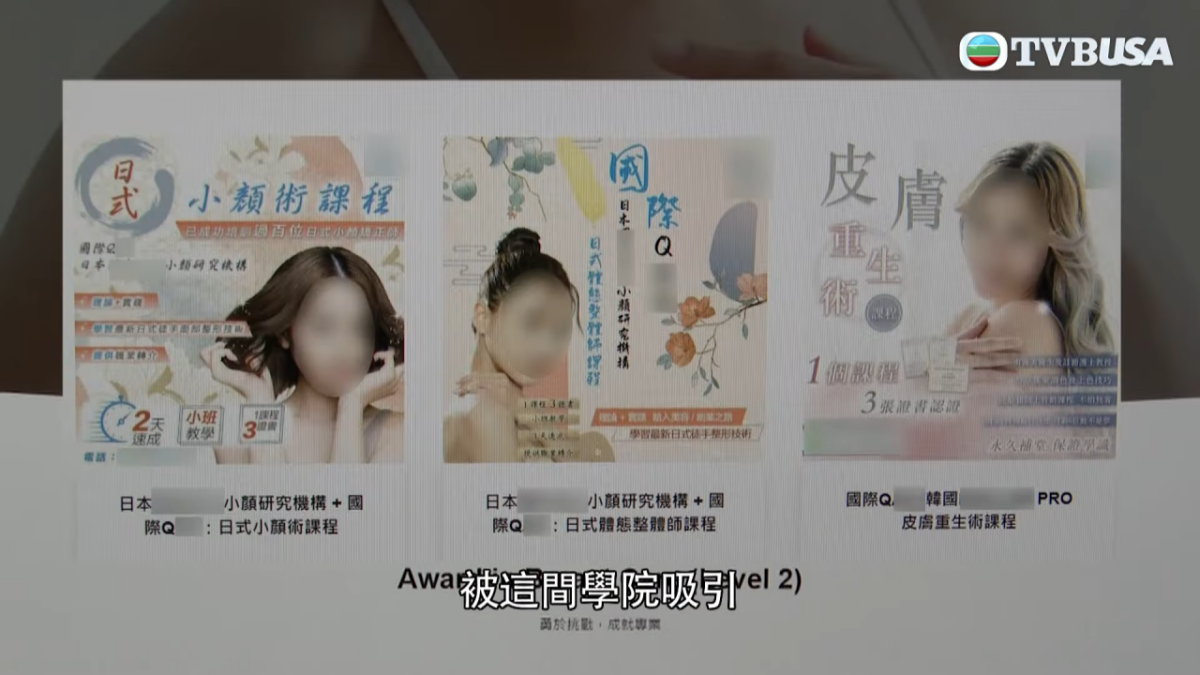 苦主楊小姐從事美容行業,她表示有一天她在Facebook看到一間學院,對方聲稱持有各國的權威認證,課程完成後還可以獲取國際認證證書,於是她在2021年決定報讀其中四個美容課程,學費合共超過5萬元。到了去年4月,楊小姐再透過該間學院報讀一個聲稱有日本權威認證的「日式小顏術課程」,雖然上堂全程都是利用假人頭來練習,沒有真人實操,但起初她都未有起疑心。