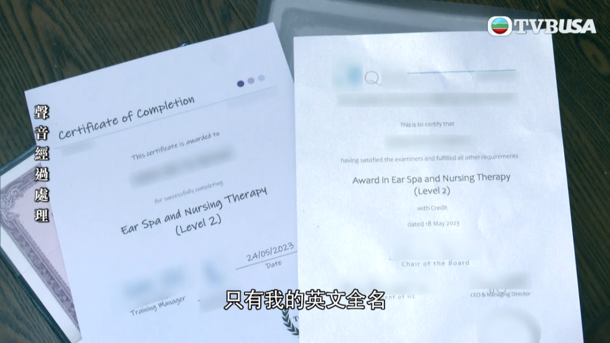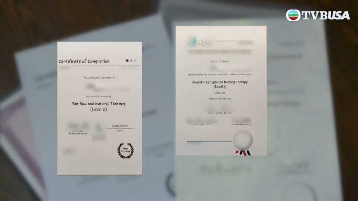 另一位苦主Selina則同樣報讀了該學院的「採耳課程」,但其後她卻發現證書上並沒有詳細列明報讀人的資料,包括中英文全名、出生日期、身份證號碼、親筆簽名、鐳射貼紙認證和考試成績,而只有報讀人的英文名字,令她不禁質疑「只要有一個人跟我同名同姓,拎住證書就可以話係佢」,從而開始懷疑證書可能是造假的。