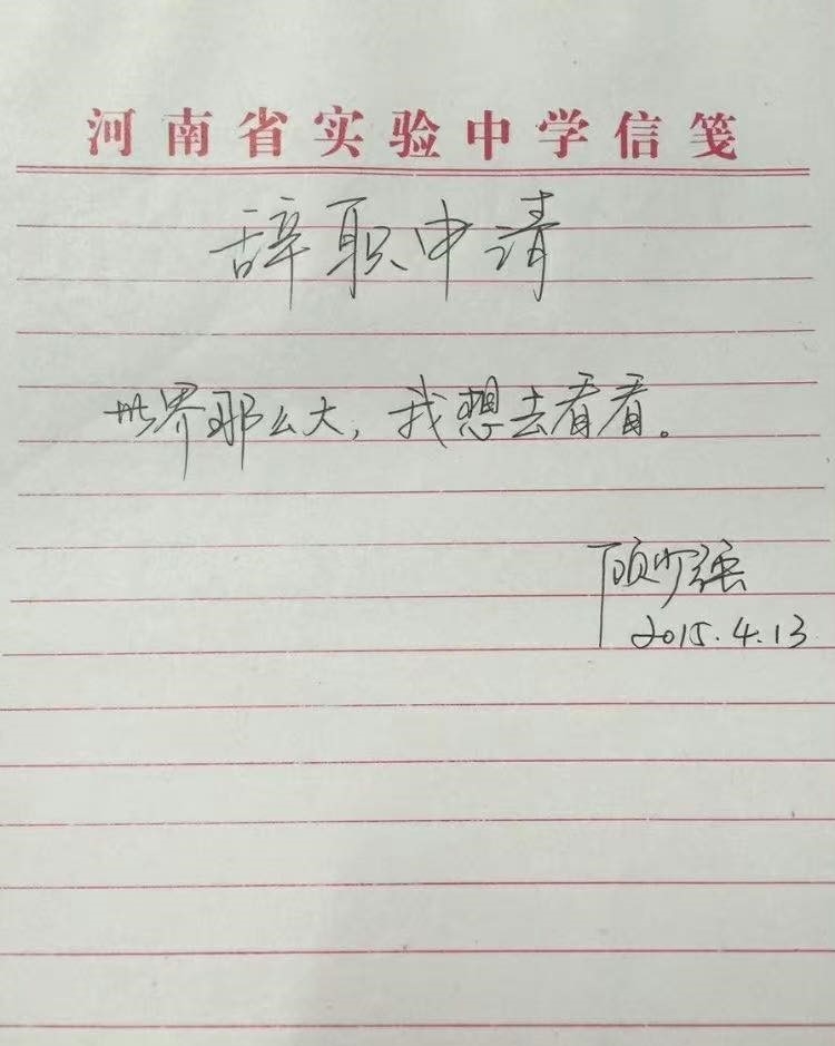寫下這封辭職信的女老師名叫顧少強,來自河南鄭州,畢業於河南師範大學教育心理學,之後就到了河南實驗中學擔任老師。據當時網友所述,河南實驗中學是一所非常好的的學校,如果能夠進入到該校裡工作收入可以說是相當優渥。不過原本按部就班生活的顧少強,卻在35歲時改變了命運。
