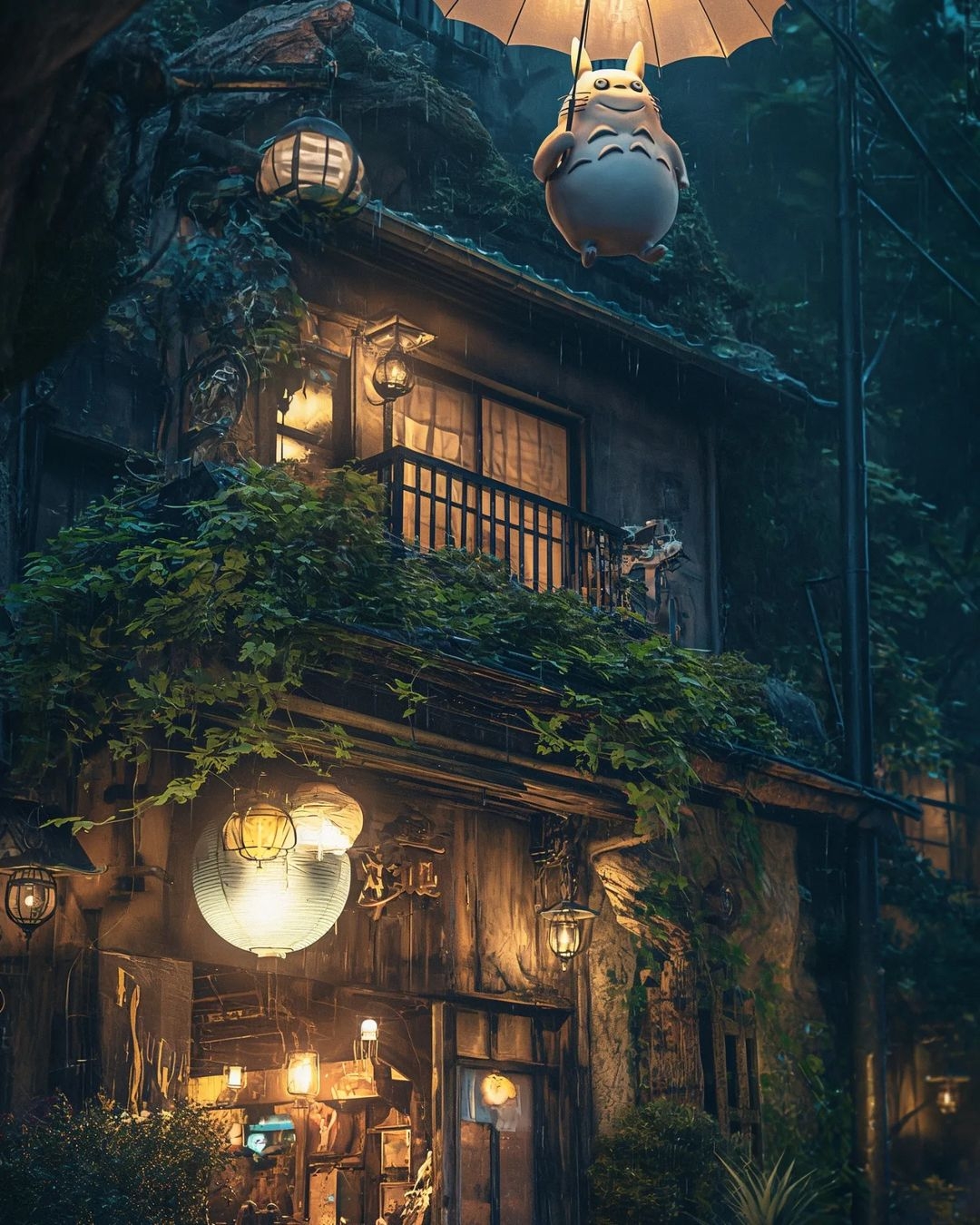 而且經過AI繪製,原本的房子也和變得不一樣,AI版本的房子處處透露著「鬼屋」的氣息,而且外面還有龍貓撐傘飛向屋頂,龍貓的表情也看起來相當詭異~