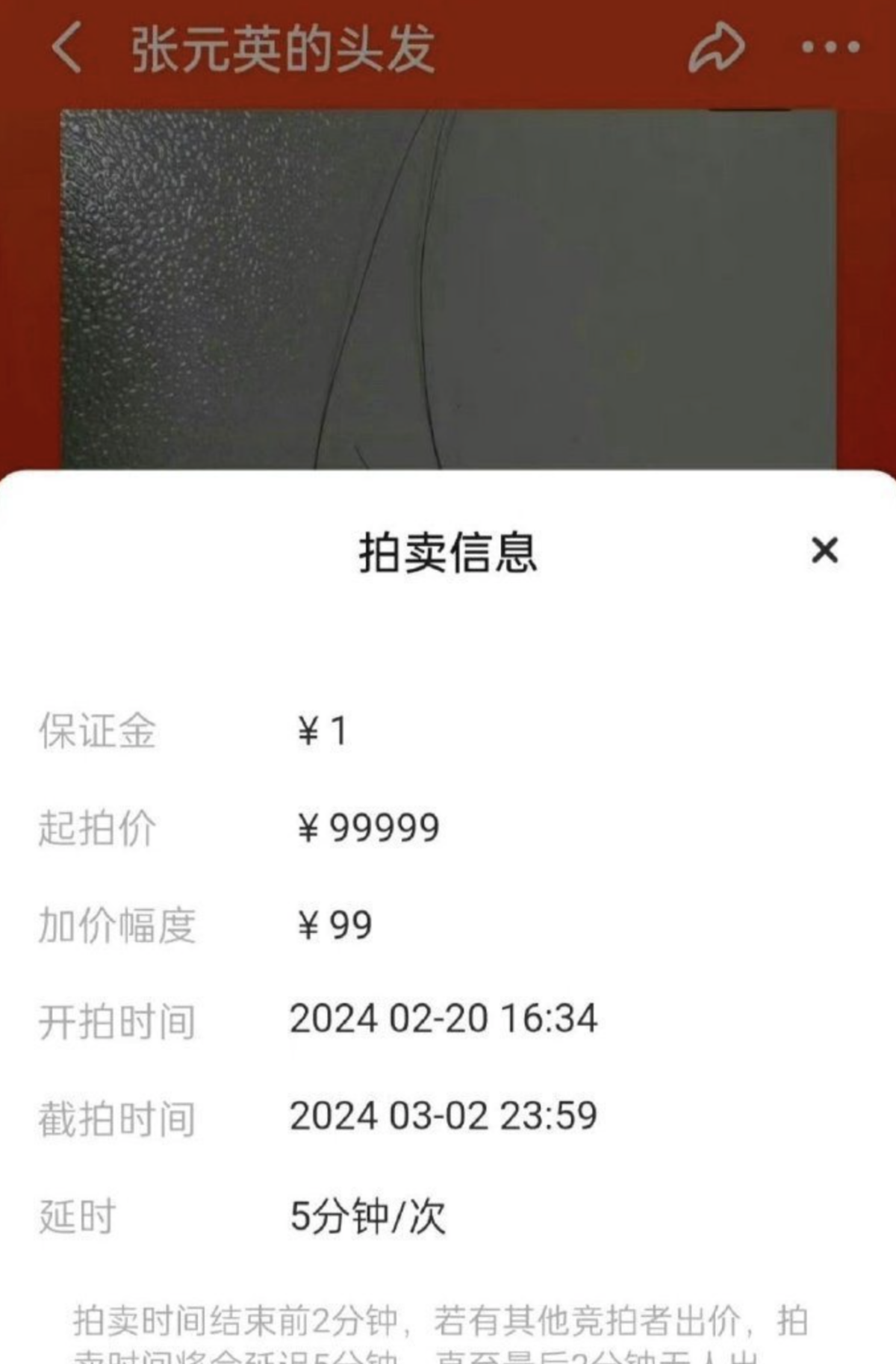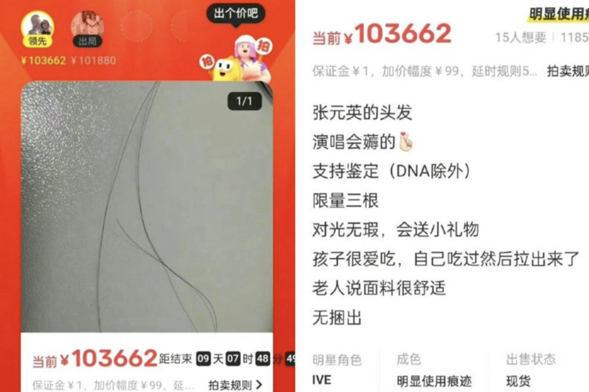 最近有網友發現在內地的拍賣網站上,竟然有人在銷售「張員瑛的頭髮」,而且還限量三根。 最令人驚訝的是,賣家更宣稱頭髮是在演唱會時拔下來的,可以進行除了DNA以外的真偽鑑定。現在的底價為人民幣99999元,每次加價幅度為人民幣99元。截至現在為止,上架才短短兩天就已經以超過人民幣10萬元(約11萬港元)!