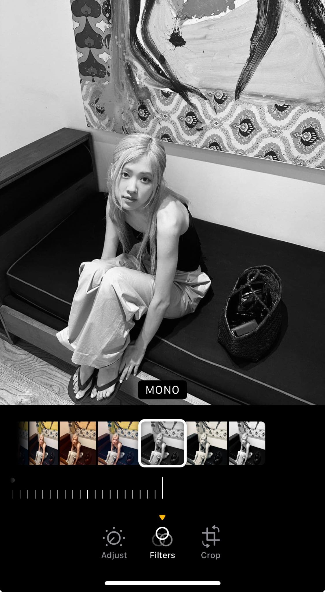 找一張照片,把濾鏡調整到「黑白」。建議可以選擇正臉對著鏡頭的照片,臉上可以是素顏或帶著淡妝,但不建議濃妝。