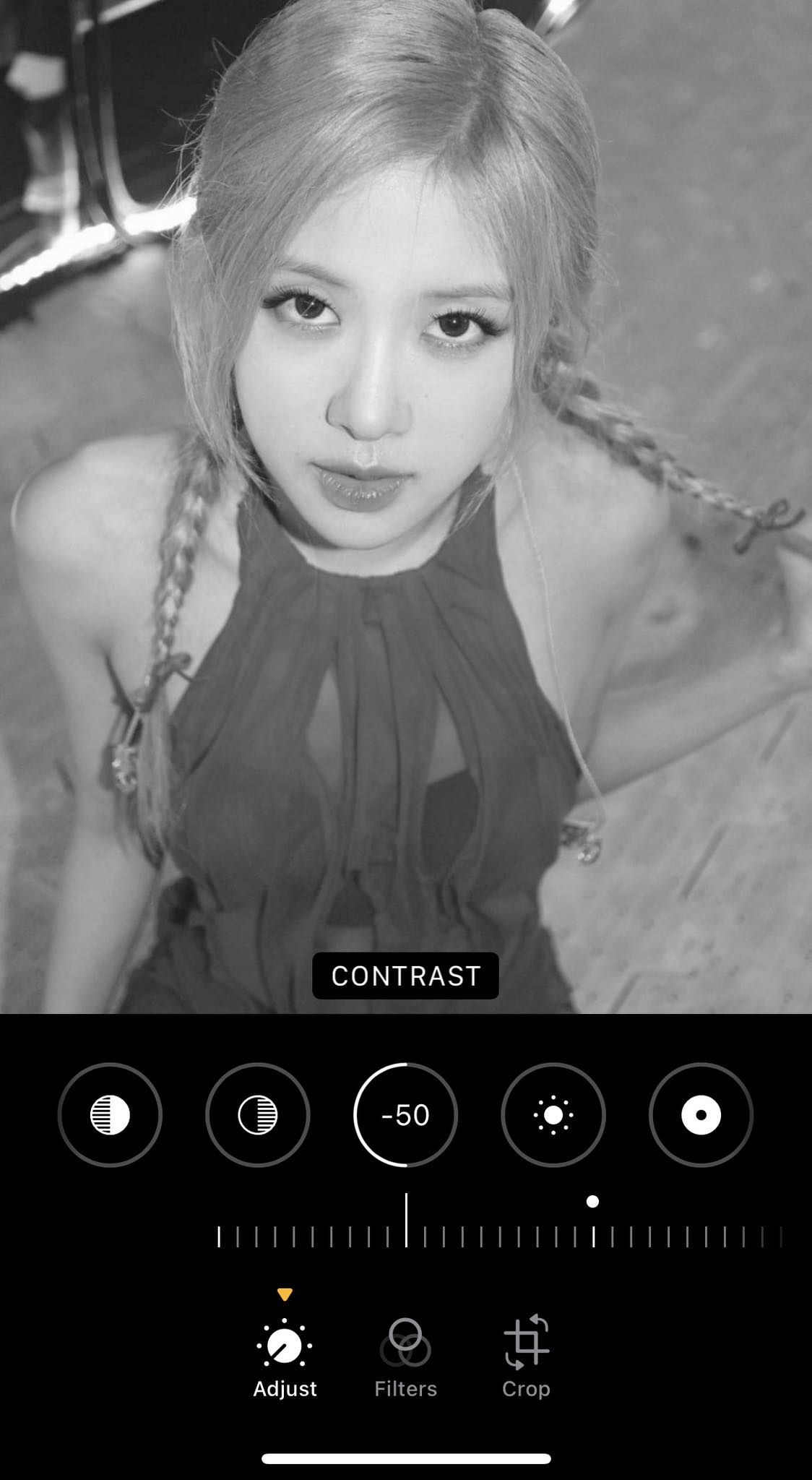 雖然差異並沒有很大,但是以BLACKPINK的Rosé 和Lisa作為對比,兩人就明顯看得出自己的屬性。Rosé 作為團體內的淡顏系美女,照片可以發現「對比度-50」比「對比度+50」時看起來更舒服好看,濃妝的她可能因為妝容的厚重而看不見清秀的五官。