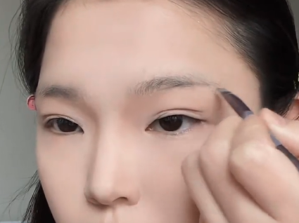 此妝容的重點在於眼妝。美妝博主「夏的魚」分享,先使用灰啡色眉筆從眉尾至眉峰位置勾勒出眉毛,其後使用修容色大範圍在上下眼瞼作打底。