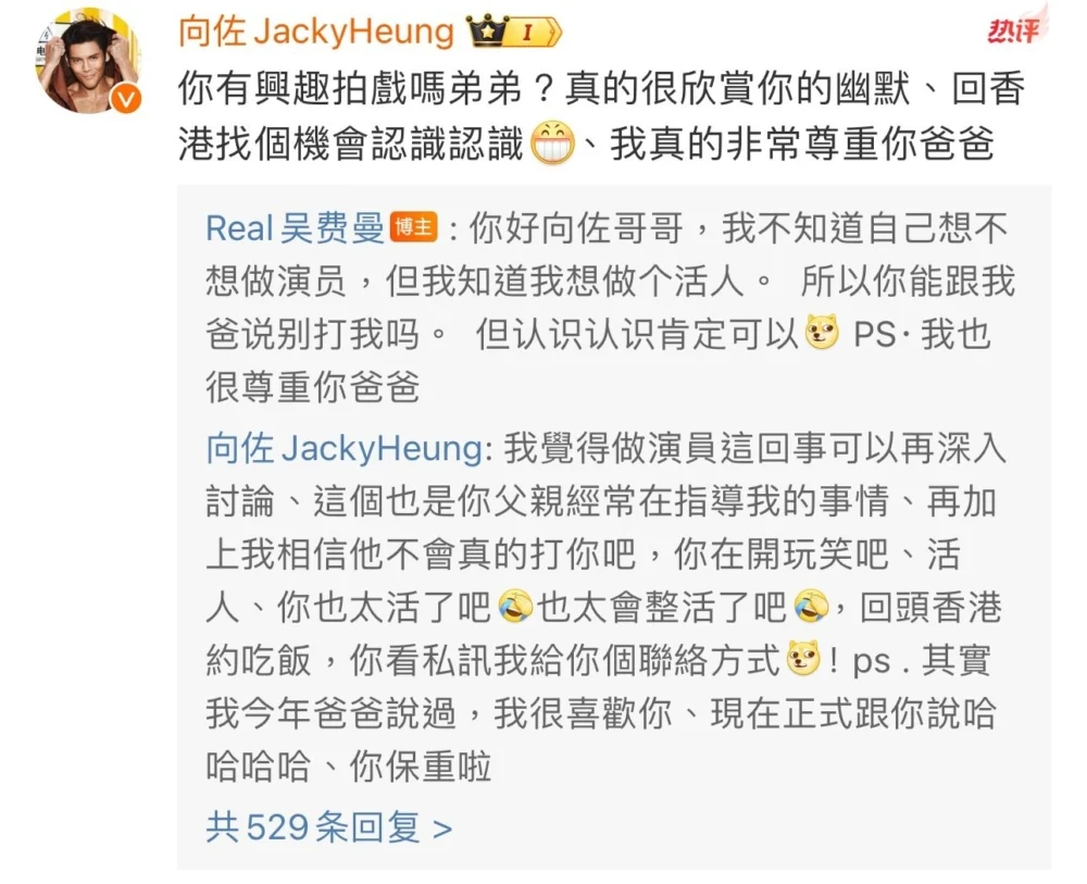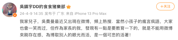 事後吳鎮宇也有在微博上發文回應:「我家兒子,吳費曼最近又出現在微博,頻上熱搜。當然小孩子的瘋言瘋語,大家也會一笑而過,但作為家長的我,發現有一點是要教育一下的,就是不能用微博來刷存在感,為博取別人的眼光而活,是一個可悲的活著!」看來吳鎮宇是真的非常生氣,希望Feynman之後一切安好!