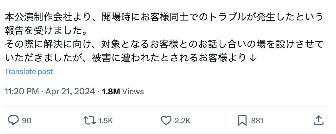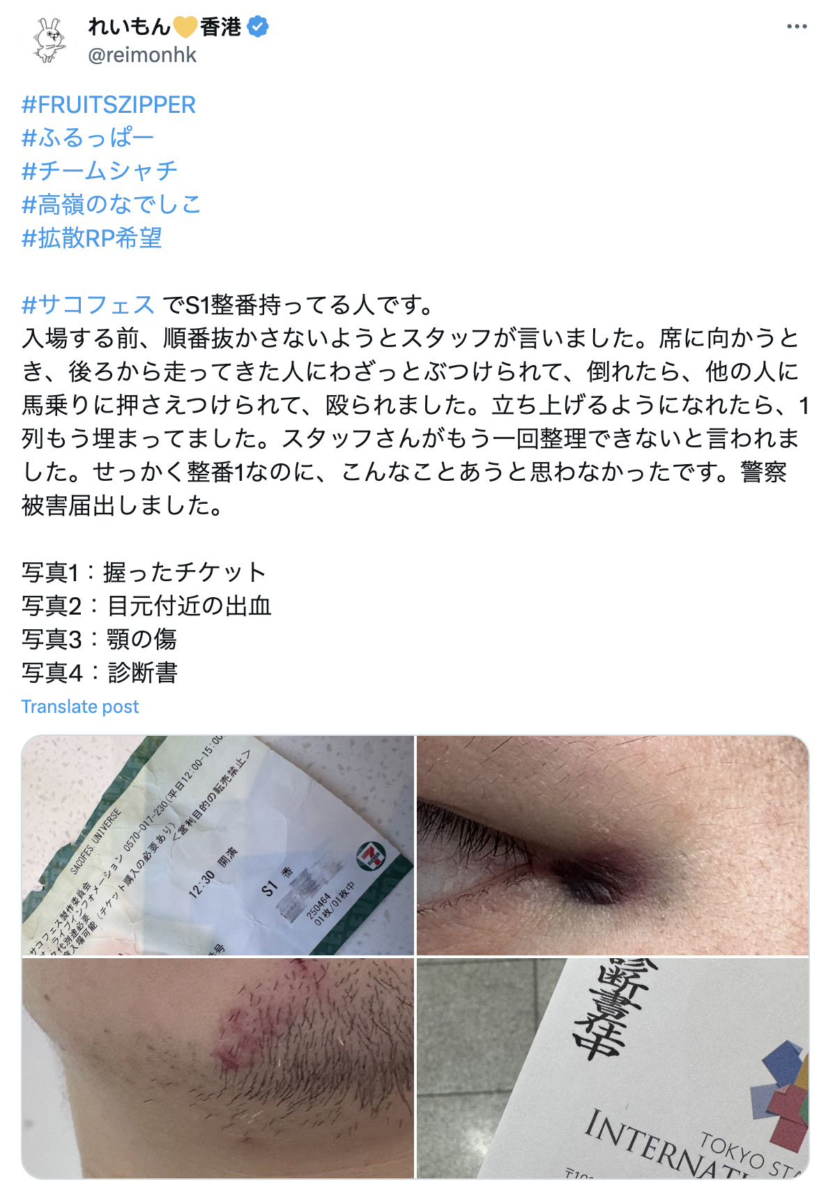 事源一位名叫「Reimon」的香港網友在社交平台發文表示自己疑因爭位問題被打。網友表示自己是日本女團「高嶺撫子」的歌迷,當日正準備入場欣賞「SACO FES」的音樂節活動。Reimon原本取得頭位入場,正當他以正常步速走向自己想要的位置時,中途突然有人上前把他推倒在地造成其臉部受傷:「後邊突然有人跑過來,把我推在地上搶走了中間的位置。之後另一個人就按住我,打我的面,一直按實我直到第一排全部位置給人坐滿。」
