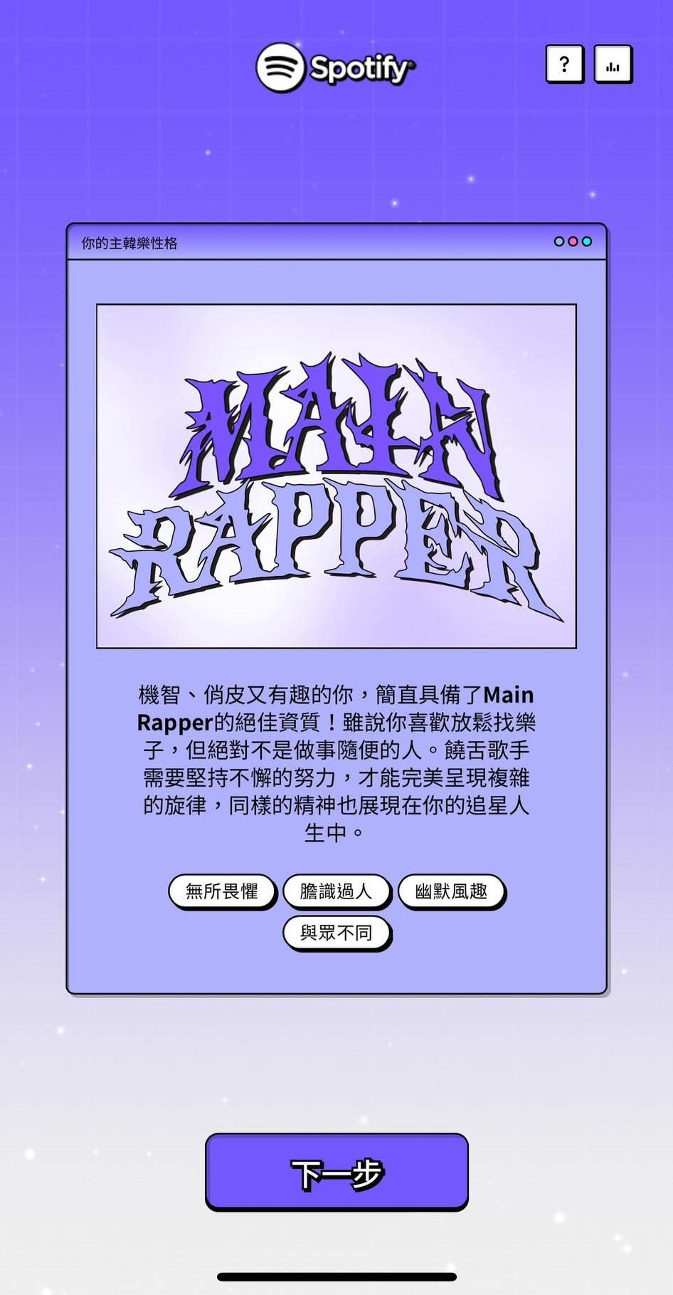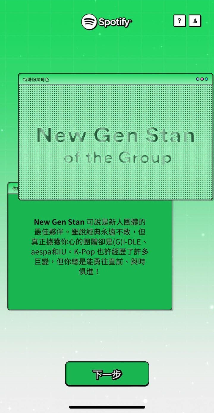 如果是Spotify付費用戶,就有機會進入進階的測驗頁面,還可以解鎖特殊KPOP性格!好似「Maknae」(忙內)、「 New Gen Stan」等。如果不了解是什麼意思也可以參考測驗內的附贈解釋,好似小編就是New Gen Stan,即是代表新人團體的最佳夥伴哦!這麼好玩的KPOP的測驗絕對不要錯過!