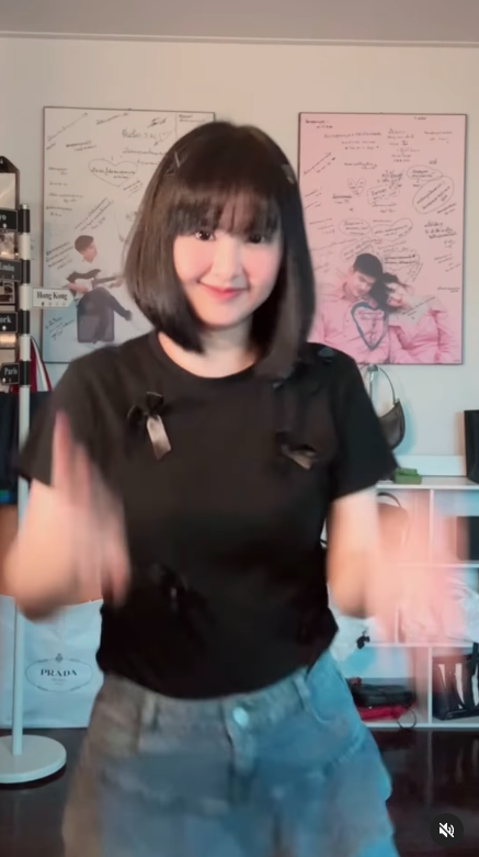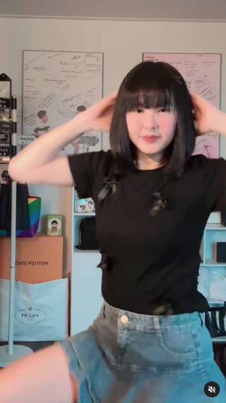 早前Chiquita的媽媽在社交平台上傳了自己跳《SHEESH》舞蹈的影片,可見她留有一頭黑色齊瀏海短髮,又穿上蝴蝶結上衣配牛仔短裙,看上去非常年輕~