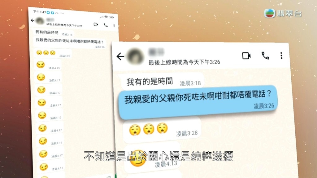 大女兒則曾在凌晨12時至清晨5時無間斷打了接近50次電話給他,甚至透過訊息出言侮辱:「我親愛的父親,你死咗未?咁耐都唔覆電話」,但未知是出於關心還是想滋擾。而細女婿更曾對他粗口回應。