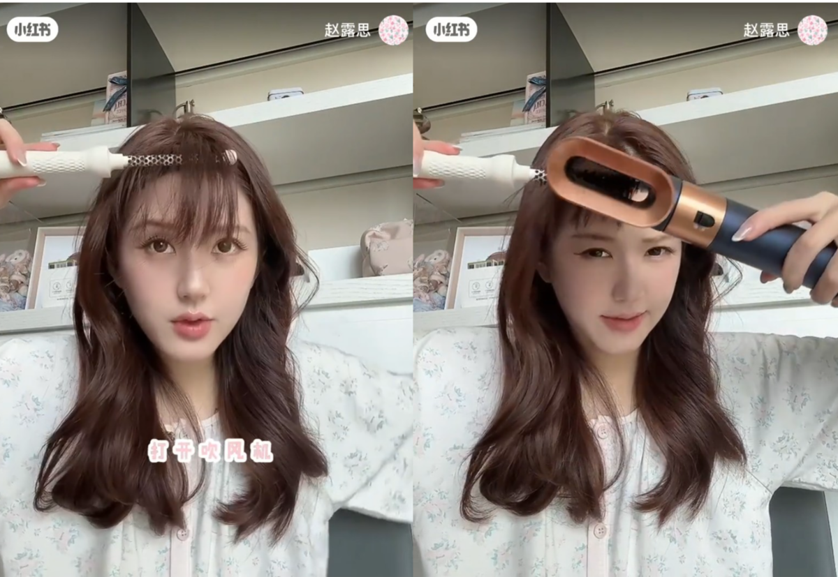 來到瀏海的部分,有時直接用捲髮棒夾瀏海的話,很容易會失手,而趙露思會利用圓梳和風筒打造出好看的瀏海~首先將瀏海放到圓梳上,用風筒貼著圓梳,一邊向內沿住弧度往下拉,瀏海便會變得立體又有自然的弧度,再慢慢調整成自己喜歡的髮型就可以了!
