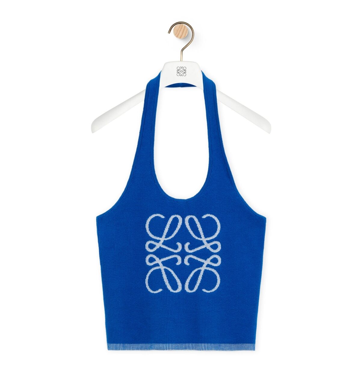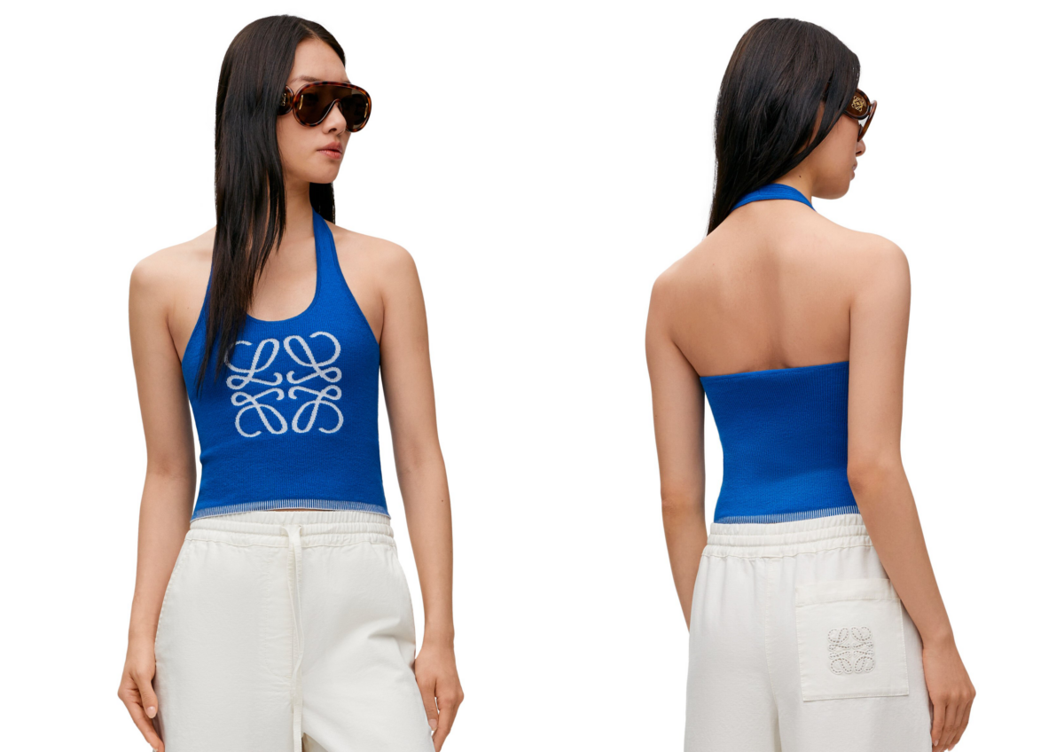 夏天當然少不了鮮艷的顏色,加上近年針織item也是十分受歡迎,LOEWE這款掛頸背心就是不錯的選擇!搶眼的藍白色配色,正面綴有經典Anagram Logo,下襬還有縫線小細節,十分好看。而且修身加上大露背的設計超吸睛,完美展現出身材曲線~